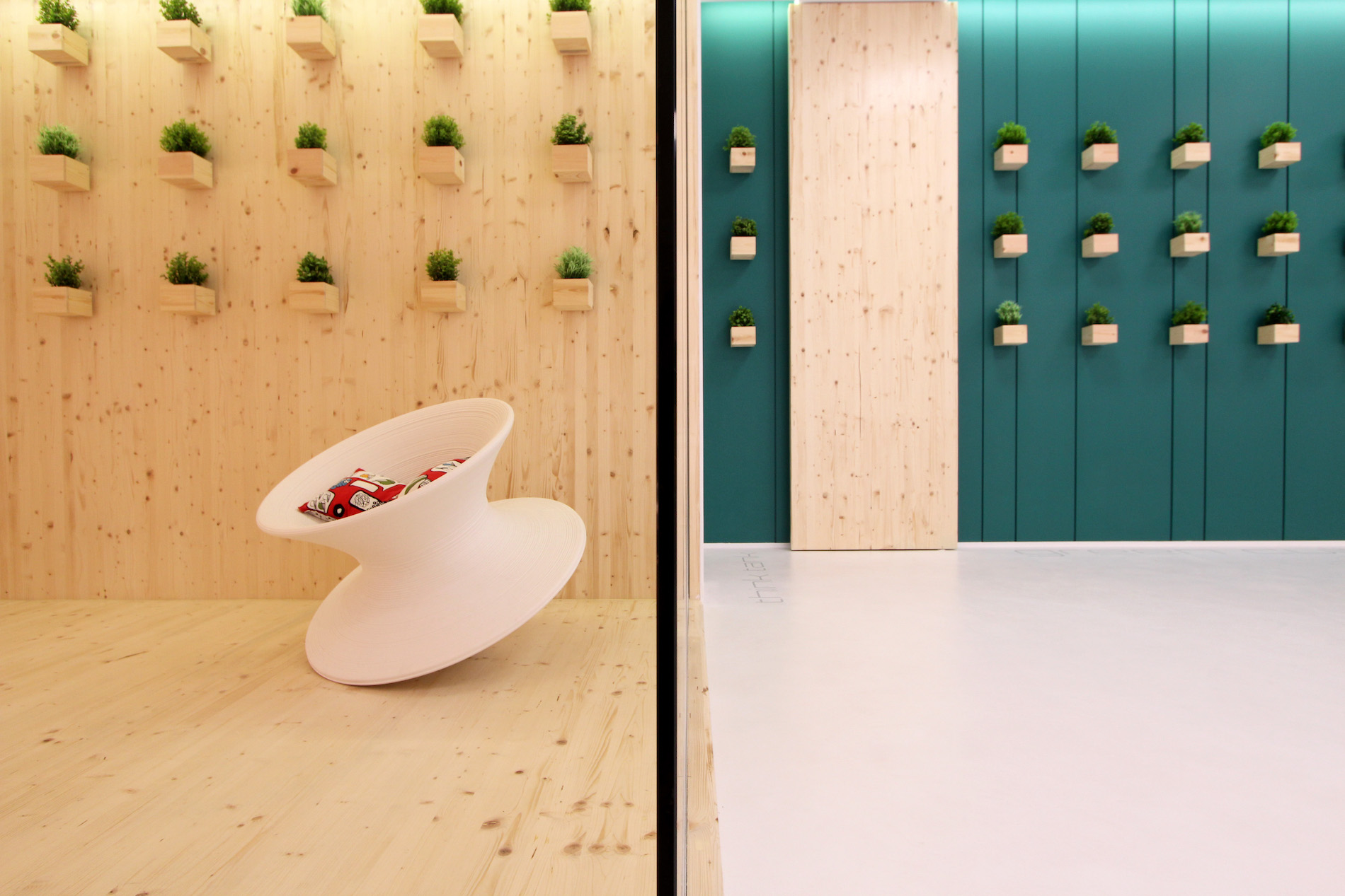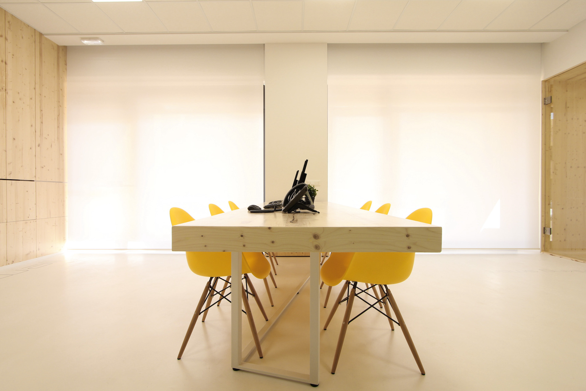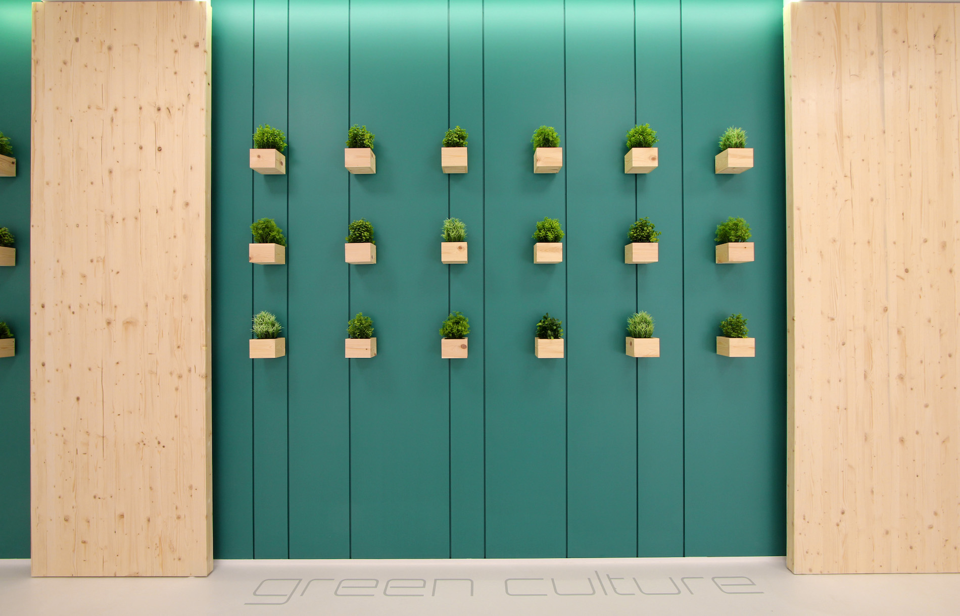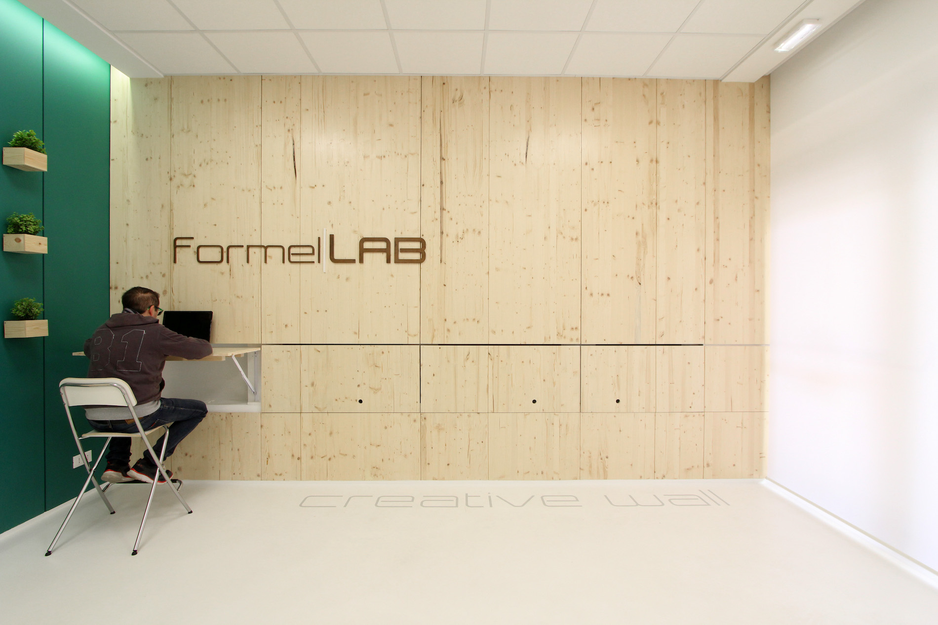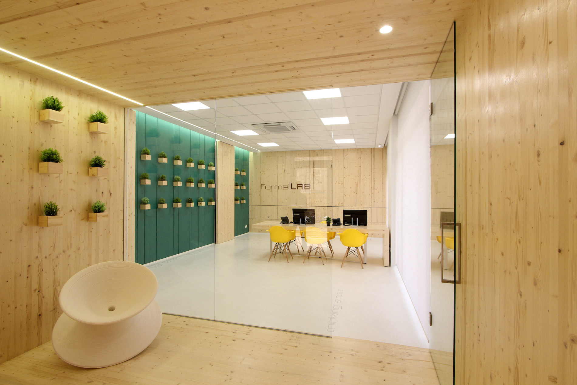 La seconda parete pannellata è quella “vegetale”, tinteggiata in verde petrolio e caratterizzata da una serie di cubi portavasi sempre in abete, che nasconde al suo interno spazi contenitivi, funzionali e ripostigli, oltre al passaggio diretto al resto degli uffici aziendali. Il grande tavolo con otto postazioni di lavoro, disegnato e progettato su misura, si colloca simbolicamente al centro dello spazio.