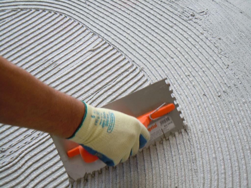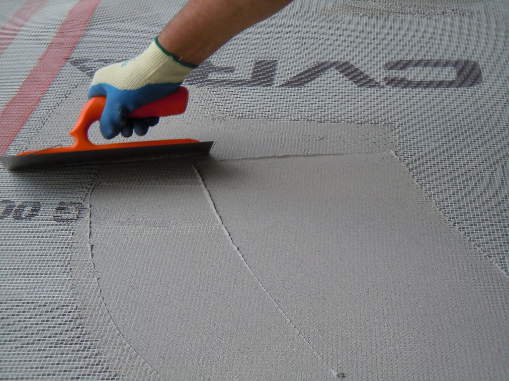 Ove si esegua contemporaneamente impermeabilizzazione e posa in opera delle piastrelle sarà eseguita una prima mano di rasatura con spessore di circa 2 mm all’interno della quale sarà annegata apposita rete Cvr in fibra di vetro. Immediatamente dopo, con la spatola dentata, si procederà alla posa del collante necessario per le piastrelle.