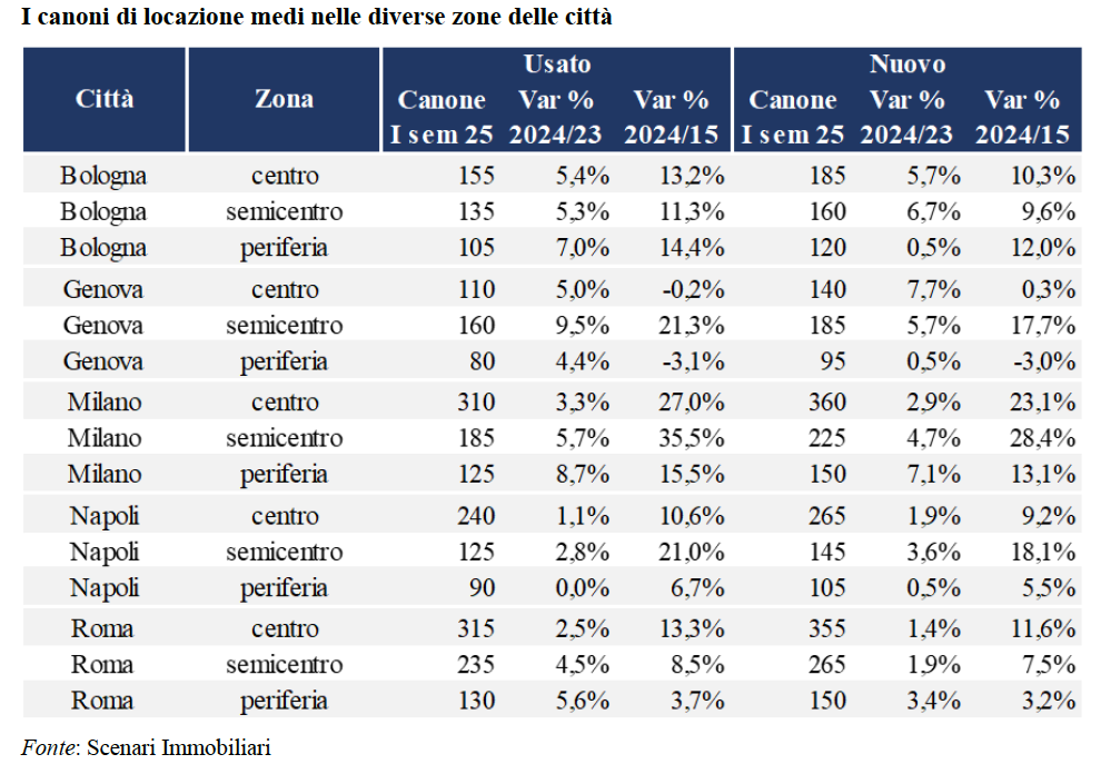 Nel corso del 2024, il mercato locativo residenziale ha continuato a registrare una crescita dei canoni medi, con dinamiche particolarmente accentuate nelle aree metropolitane e nei principali centri universitari. A livello nazionale, nel 2024, i canoni di affitto hanno registrato un incremento medio del 4,7% su base annua, con variazioni significativamente superiori in città come Milano e Roma, dove gli aumenti hanno superato il 5%. Le previsioni per l’anno in corso indicano un leggero incremento dei canoni di locazione che, a livello medio nazionale, comporterà un aumento di oltre il 4%, portando il valore medio di riferimento a superare gli 85 €/mq/anno.