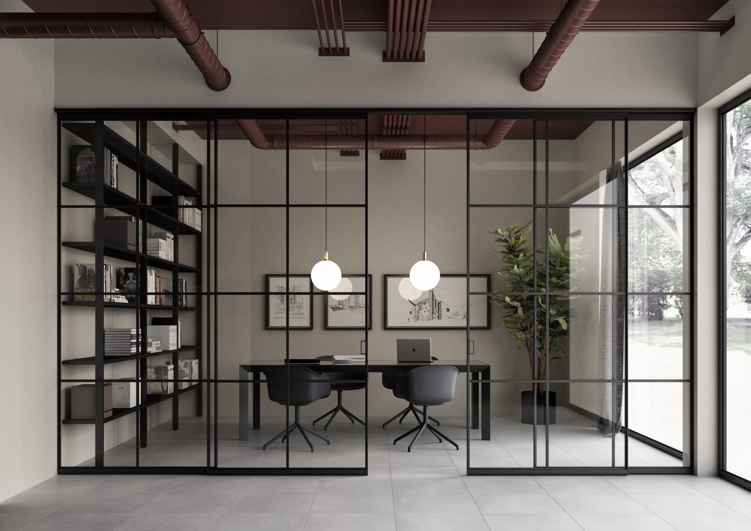 La famiglia di porte Celine, disegnata da Paolo Festa, riprende il decorativismo geometrico delle vetrate industriali di inizio ‘900 e lo declina in un sistema tecnico completo che prevede soluzioni a battente, filomuro o con cornice, scorrevoli, anche a scomparsa, e pareti divisorie.