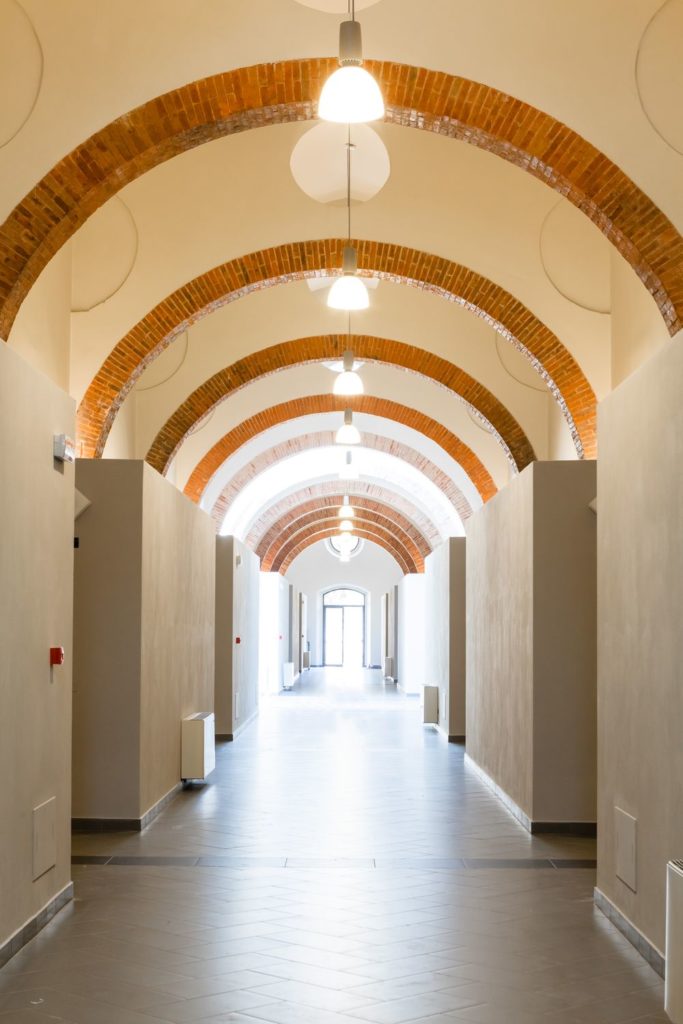 Il progetto di recupero mantiene inalterata la struttura originaria e, ove è stato possibile, la finitura degli intonaci originali e di tutte le parti in pietra e in cotto. Le piccole parti in cemento armato eventualmente rimaste in vista per motivi costruttivi e architettonici sono state martellinate per evidenziare gli appositi inerti in modo da costituire coloristicamente l’effetto cotto.