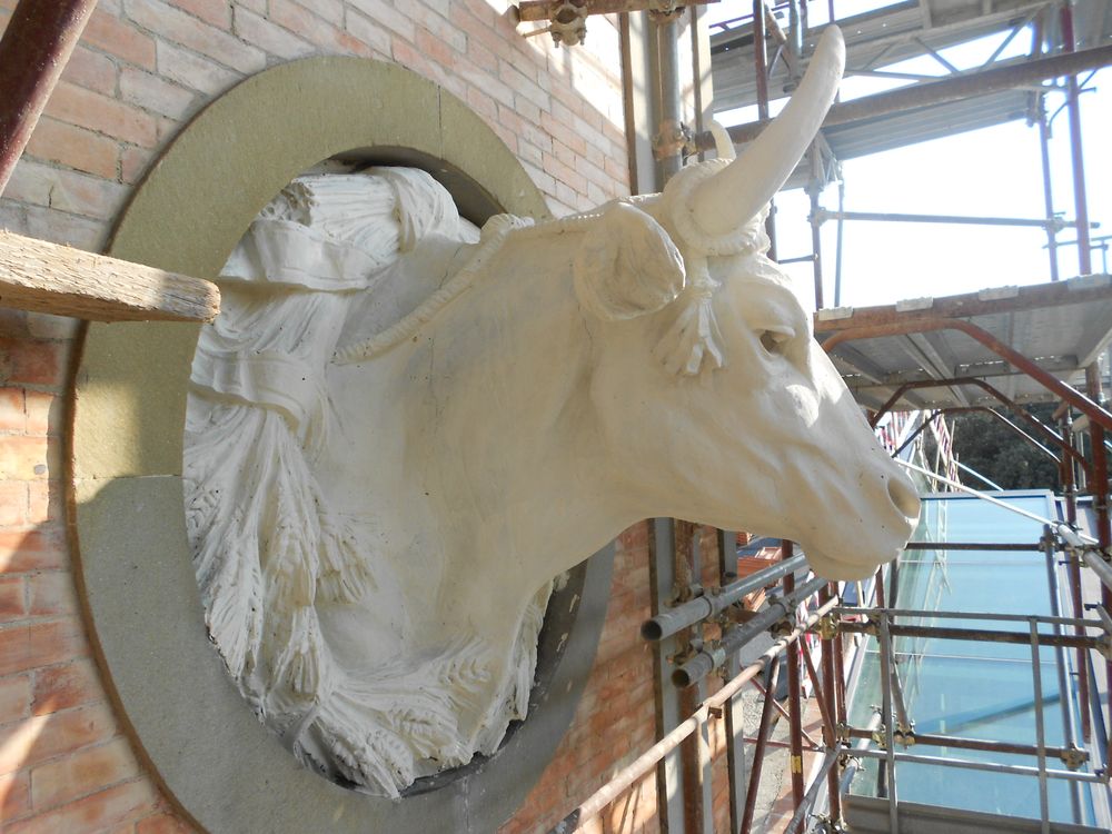 La caratterizzazione delle facciate dei fienili era affidata ai motivi decorativi delle grandi teste di buoi modellate in terracotta e inserite in cornici rotonde. Più suggestivo del tessuto esterno si presenta lo spazio interno delle stalle articolato dall’iterazione di grandi strutture ad arco.