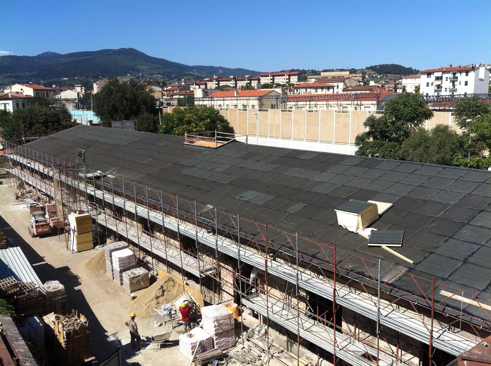 Il tetto a falde, coperto con marsigliesi, in armonia con i tetti esistenti, è completato da gronde, pluviali, e scossaline in rame brunito e per ottenere i necessari rapporti illuminotecnici, sono previsti degli ampi lucernari in copertura.