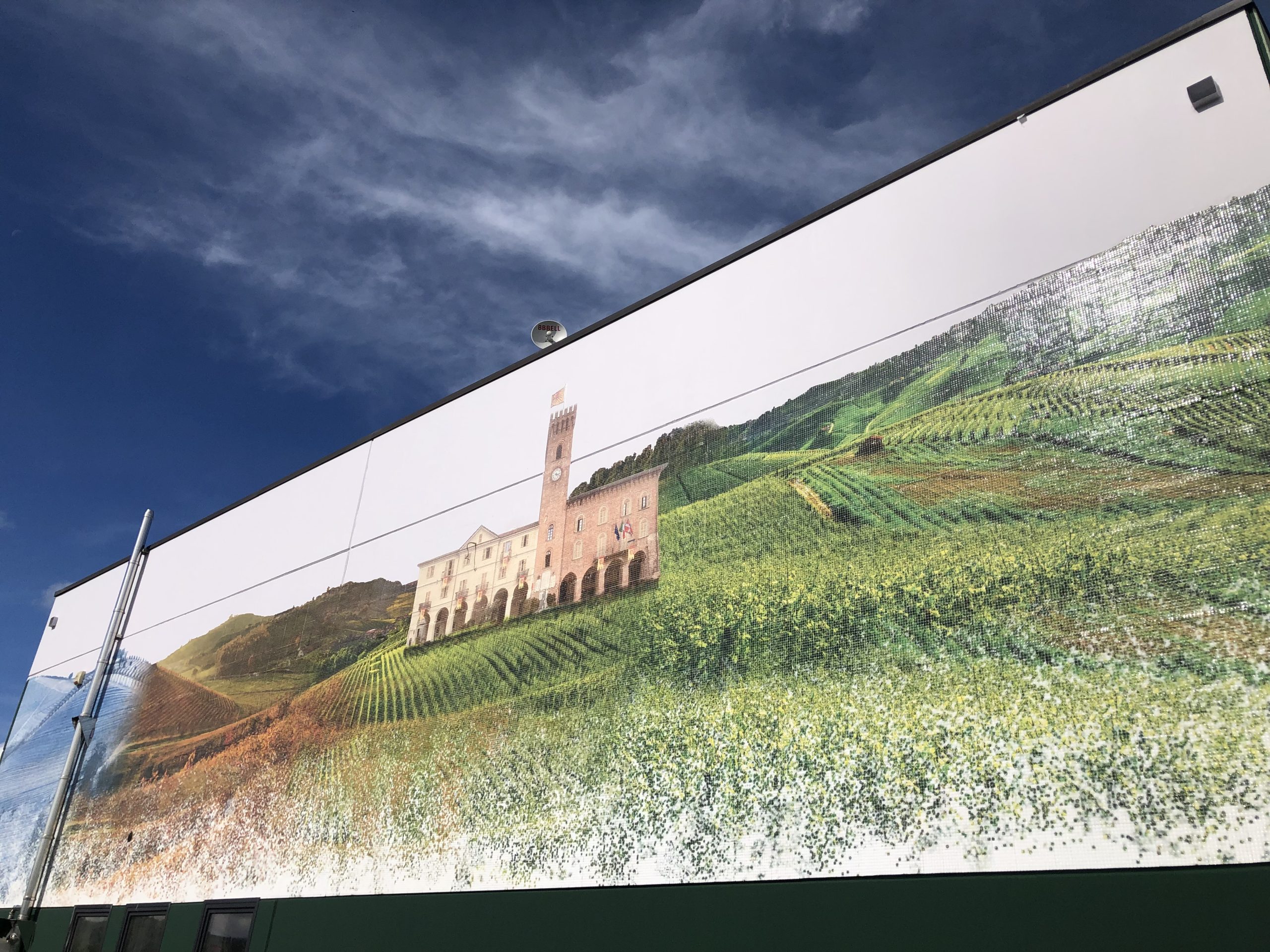 «Riproducendo un’immagine enorme, assimilando quattro fotografie realizzate in quattro location diverse delle Colline del Monferrato intorno a Nizza, in quattro periodi dell’anno, per catturare con ogni scatto le emozioni del periodo, i colori, le sfumature, le percezioni. Lavorarle in post produzione con programmi di modellazione, assemblarle ed incastrarle con un senso di continuità, facendo in modo di percepire il passaggio delle stagioni in tutto l’arco dell’anno. Infatti da sx a dx abbiamo sistemato: l’inverno, l’autunno, l’estate e la primavera, per poi ridurre e sfumare verso il basso queste immagini in milioni di pixel, come se esplodessero e si tuffassero nel colore del verde».