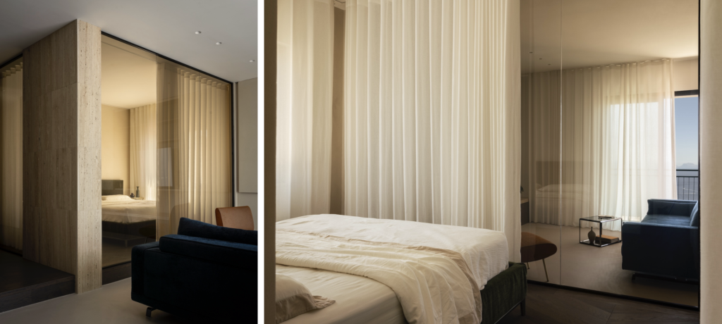 Ne è un esempio tangibile la camera padronale concepita come una sorta di scatola di vetro all’interno di una scatola più grande quale è l’appartamento stesso.