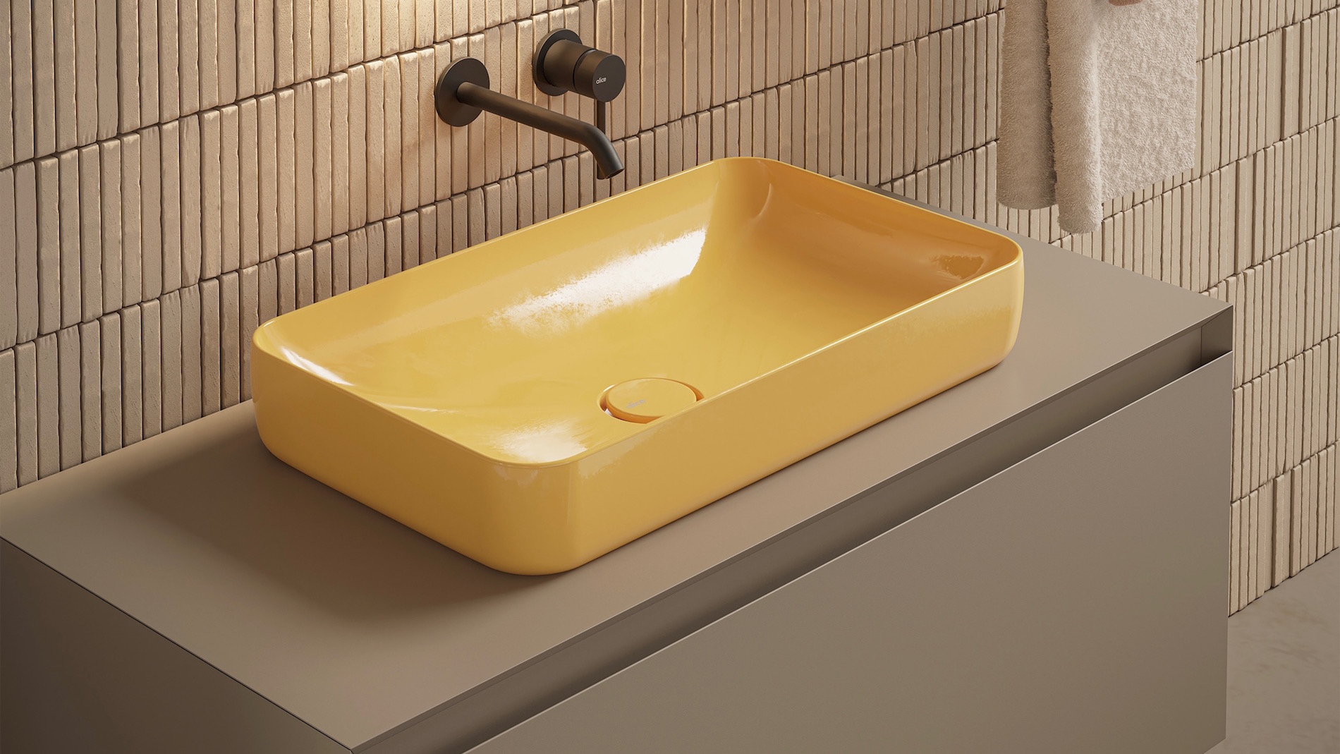 La prima serie propone tre versioni da appoggio che si distinguono grazie ad un bordo rialzato di 3 mm di spessore che corre lungo il perimetro dei lavabi ed evidenzia il piano interno di 10 cm di profondità, pensato sia per accogliere il rubinetto che per fungere da semplice mensola portaoggetti. Queste le dimensioni dei tre lavabi: tondo Ø45 cm, H12 cm; rettangolare 60×45 cm, H12 cm; ovale 60×45 cm, H12 cm.