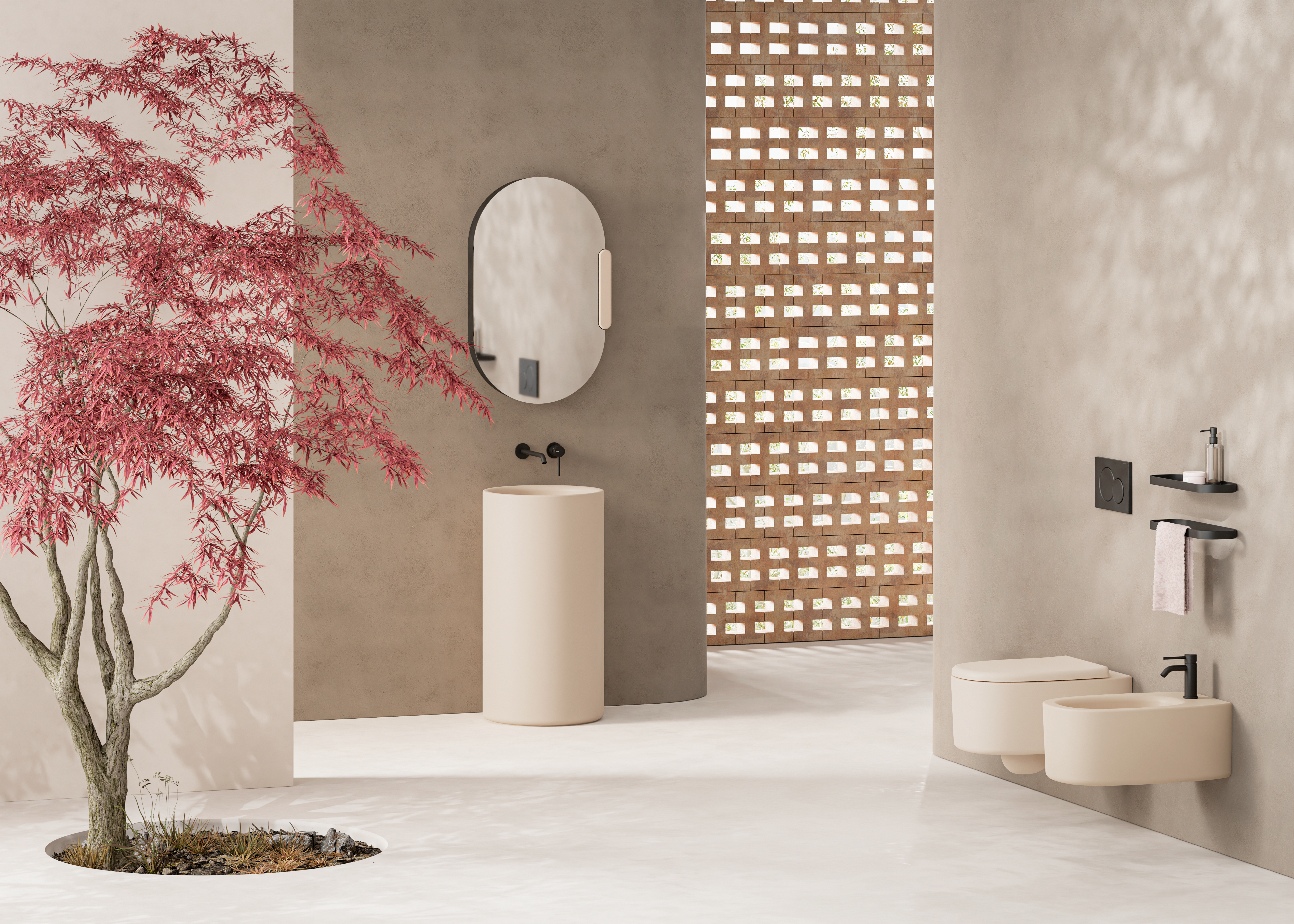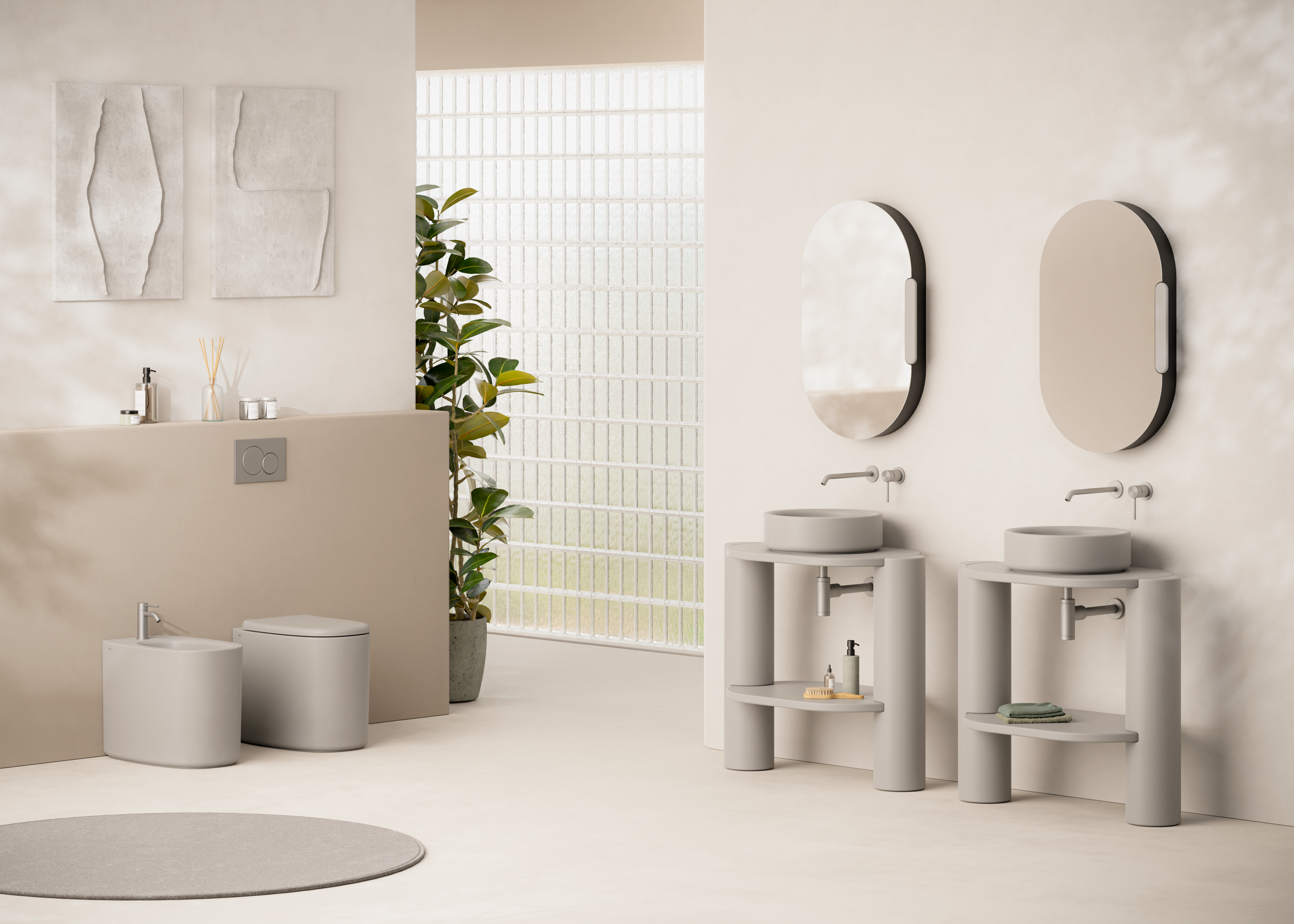 Protagonista assoluto è il lavabo da terra che arricchisce ulteriormente la collezione: dal profilo morbido ed avvolgente, si presenta come un monolite di cm 85 d’altezza e cm 45 di diametro.