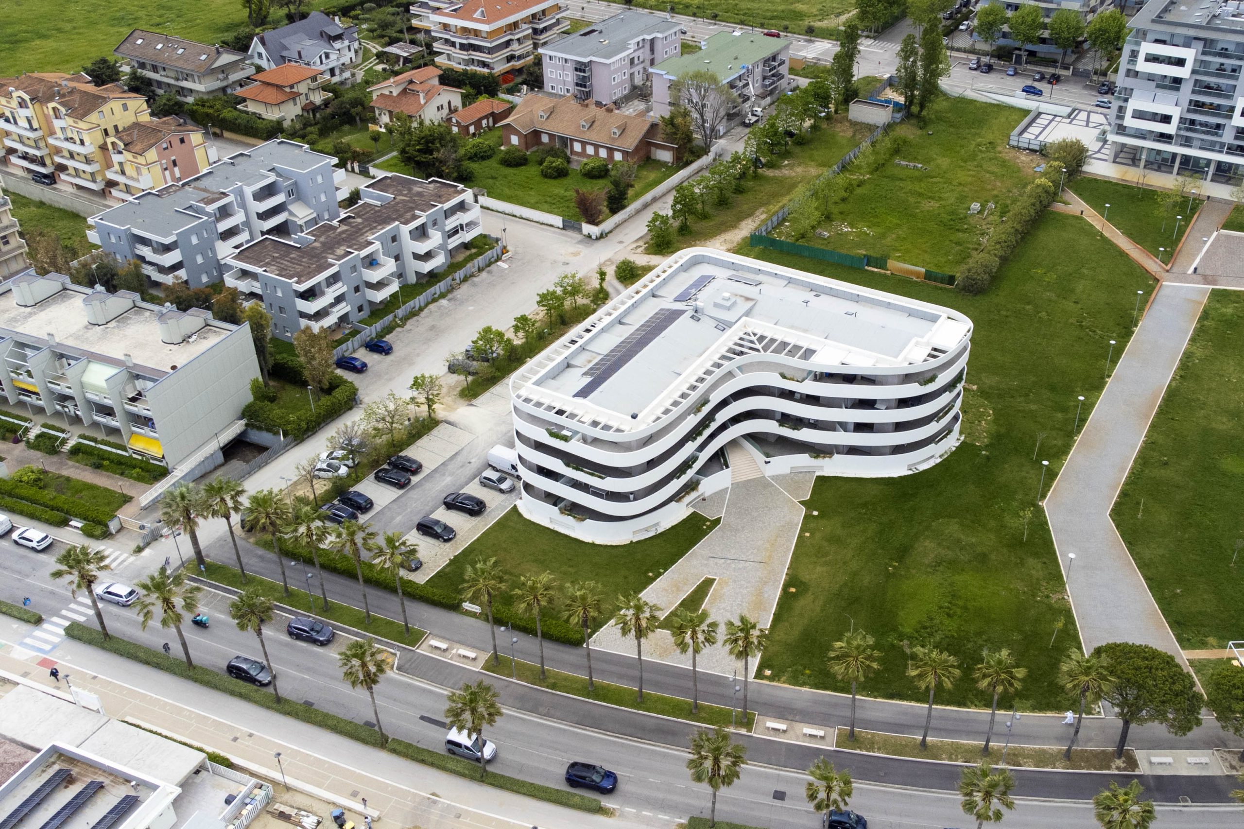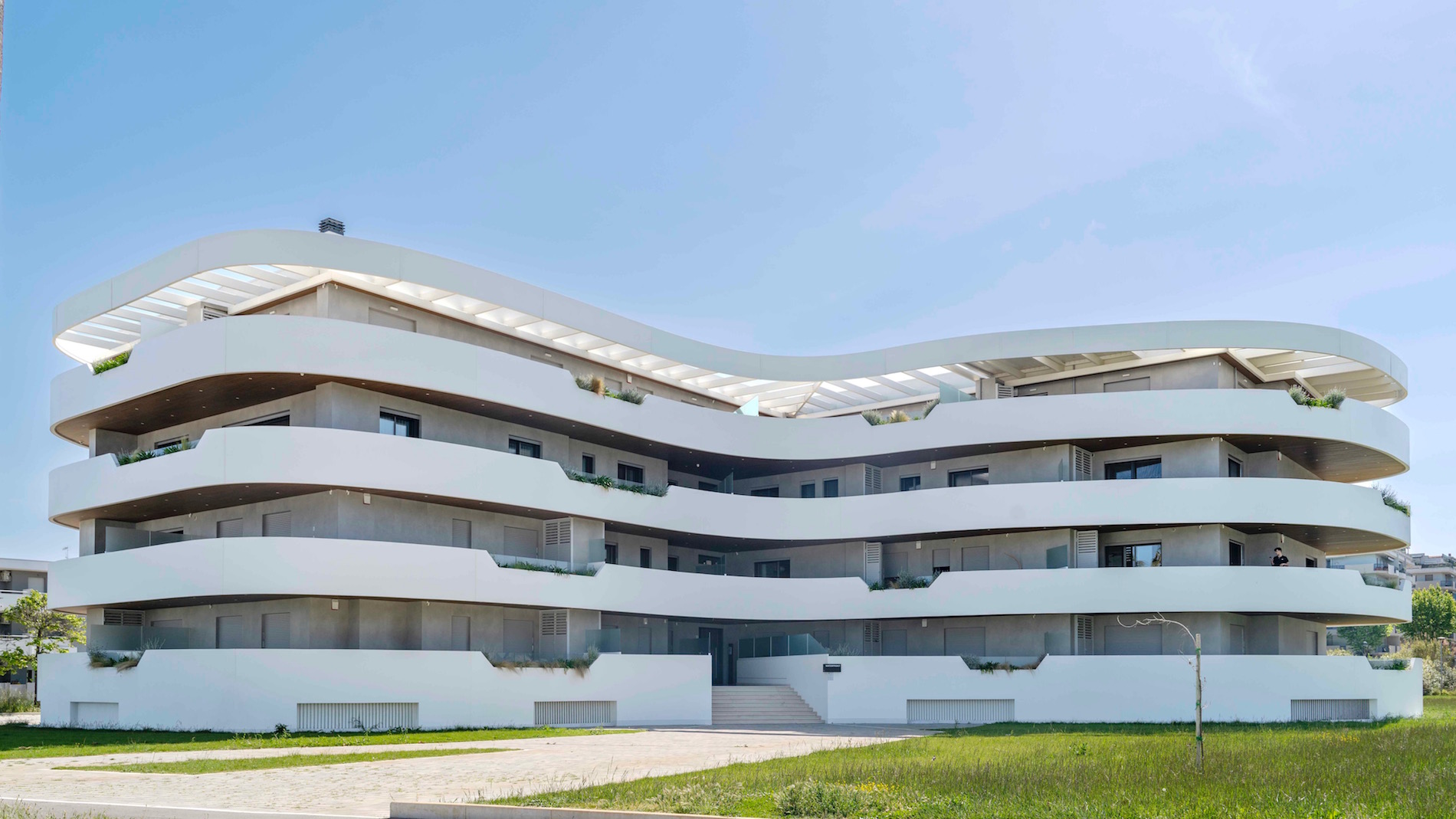 Sul lungomare di Montesilvano, a pochi chilometri da Pescara, si erge Waterfront, il nuovo progetto residenziale che fonde architettura e paesaggio con un approccio sostenibile, efficiente dal punto di vista energetico e orientato al comfort abitativo. Progettato dallo studio D&R Architetti Associati e curato da Abba Immobiliare, composta da Gruppo Abbondanza, Gruppo Balducci e Francesco Marcacci, questo complesso residenziale si distingue per un design che riflette l’ambiente circostante: le linee sinuose dell’involucro architettonico sembrano modellate dal vento e dalle onde, evocando le forme organiche del litorale e differenziandosi nettamente dagli edifici vicini caratterizzati da geometrie rigide.