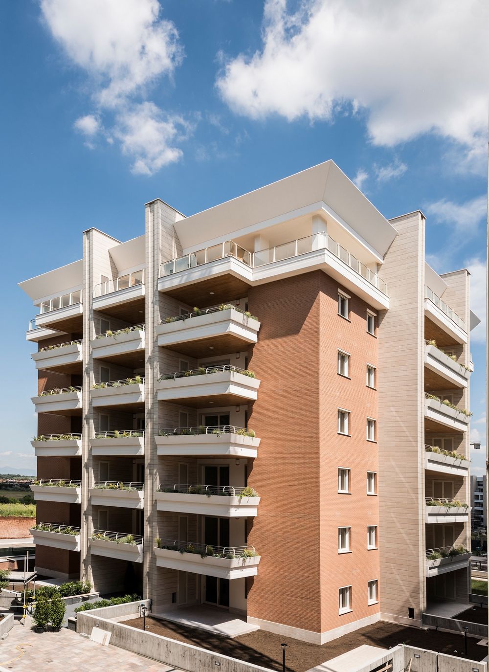 Le facciate sono rese tripartite dalla presenza di due elementi verticali rivestiti in gres porcellanato con effetto travertino, che regalano al layout estetico delle palazzine un’elegante idea di movimento. A coronamento degli edifici è stato posto un cornicione obliquo, la cui apertura verso l’alto regala maggior leggerezza al volume delle unità.