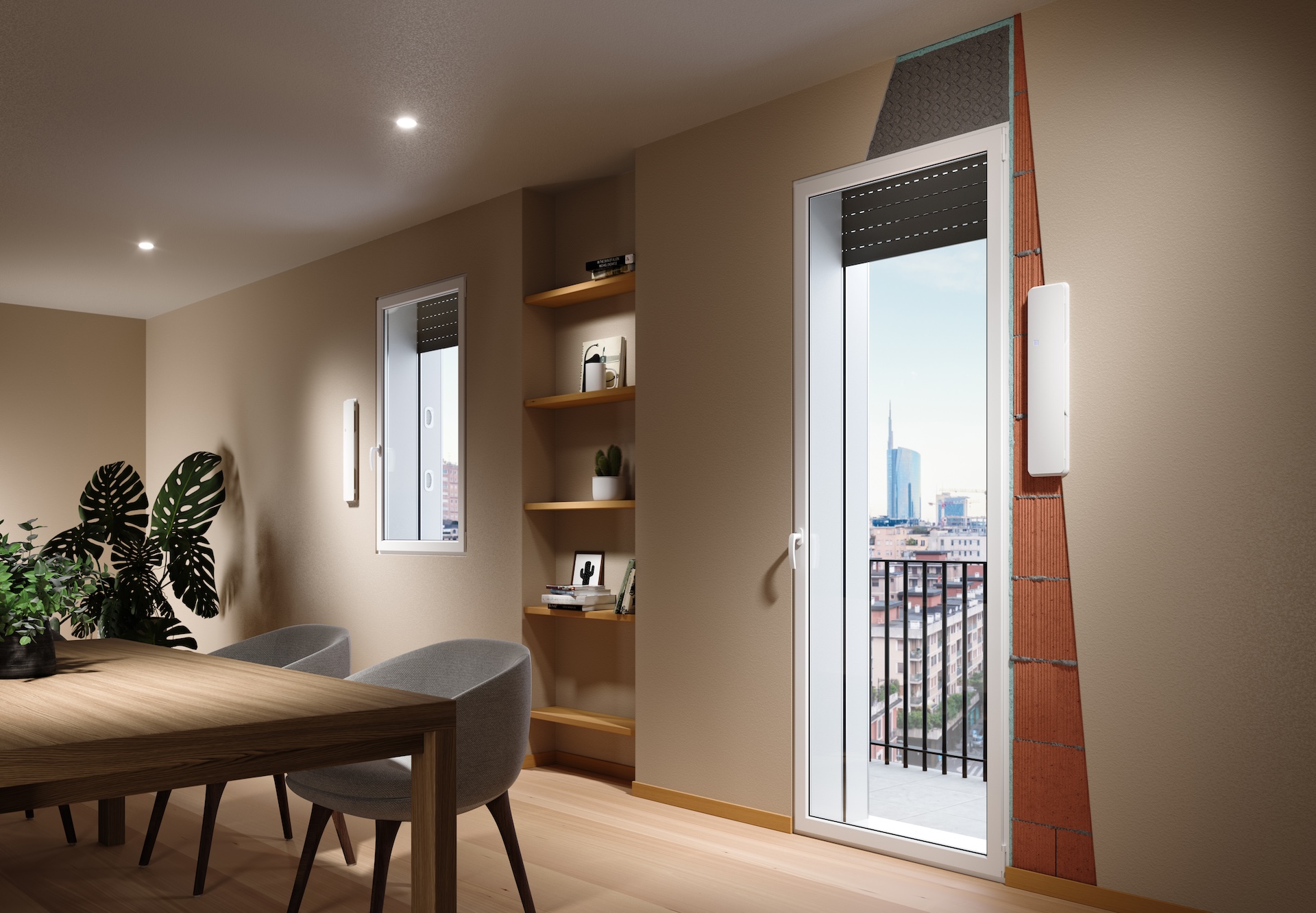 Alla base del sistema c’è il monoblocco coibentato Alpacom progettato per garantire un perfetto isolamento del foro finestra. A questo si integra il sistema Vmc Salus che assicurare il costante ricambio dell’aria negli ambienti interni, immettendo aria pulita ed espellendo quella viziata, senza causare dispersioni termiche.