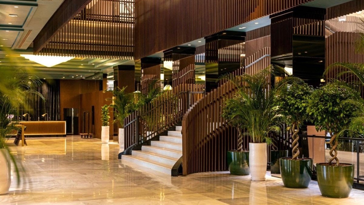 Il team di progetto ha scelto il legno Alpi  Xilo 2.0 Walnut Striped per rivestire le pareti, le colonne e l’imponente struttura a listelli che avvolge la scalinata e l’affaccio del piano superiore sulla hall.