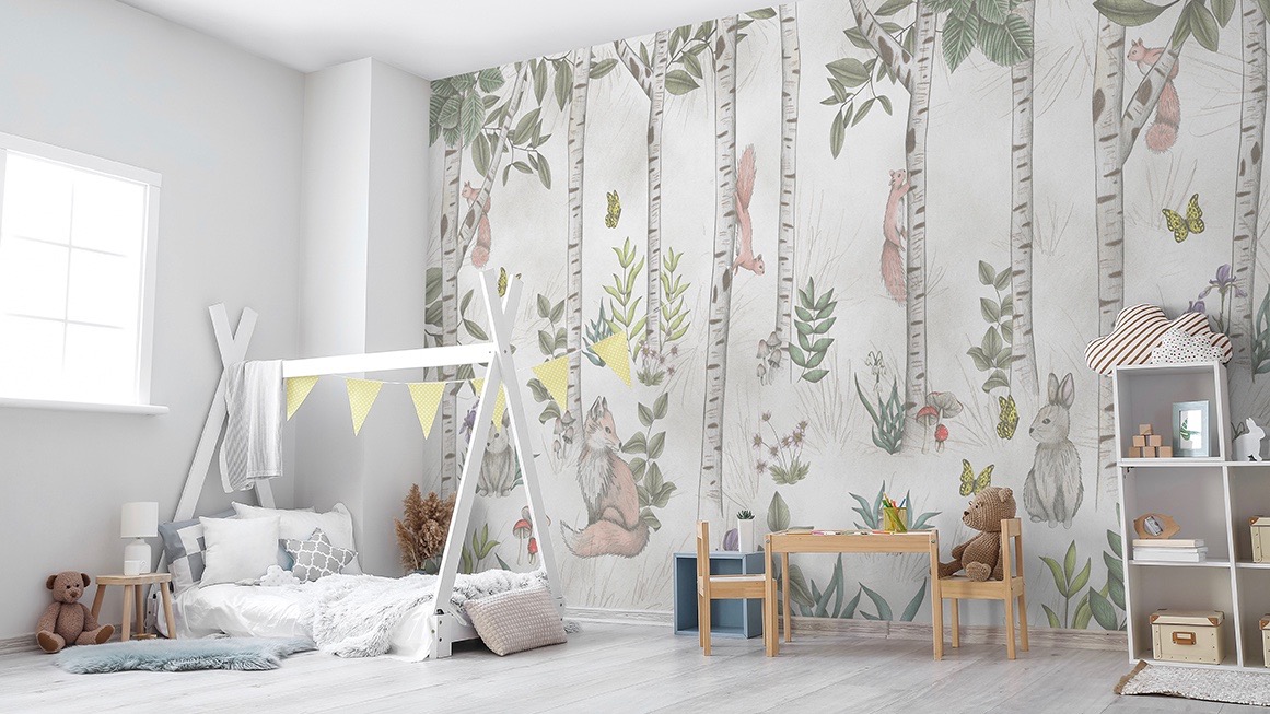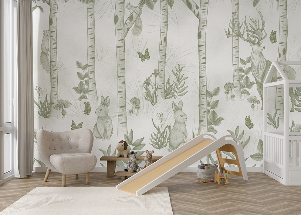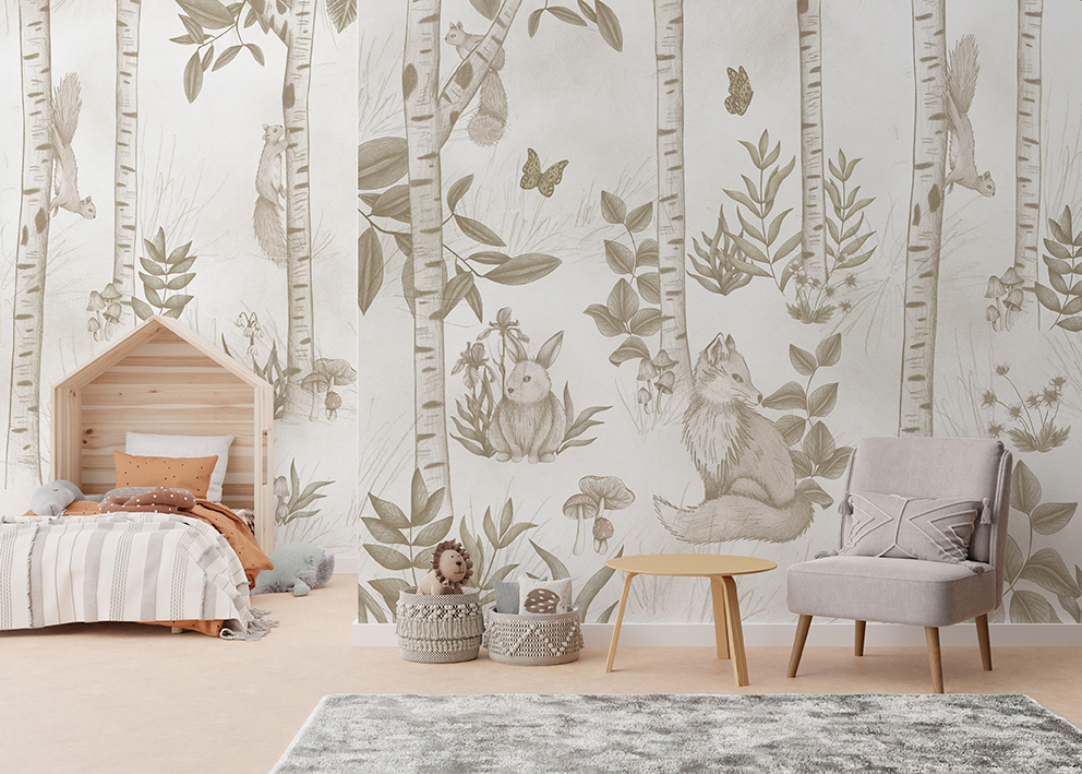 Come piccoli elfi, i bambini possono trovare riparo e conforto nella natura. La fiaba nel sottobosco mediterraneo anima la cameretta con preziosi dettagli disegnati a matita che aguzzano la vista e la fantasia.
