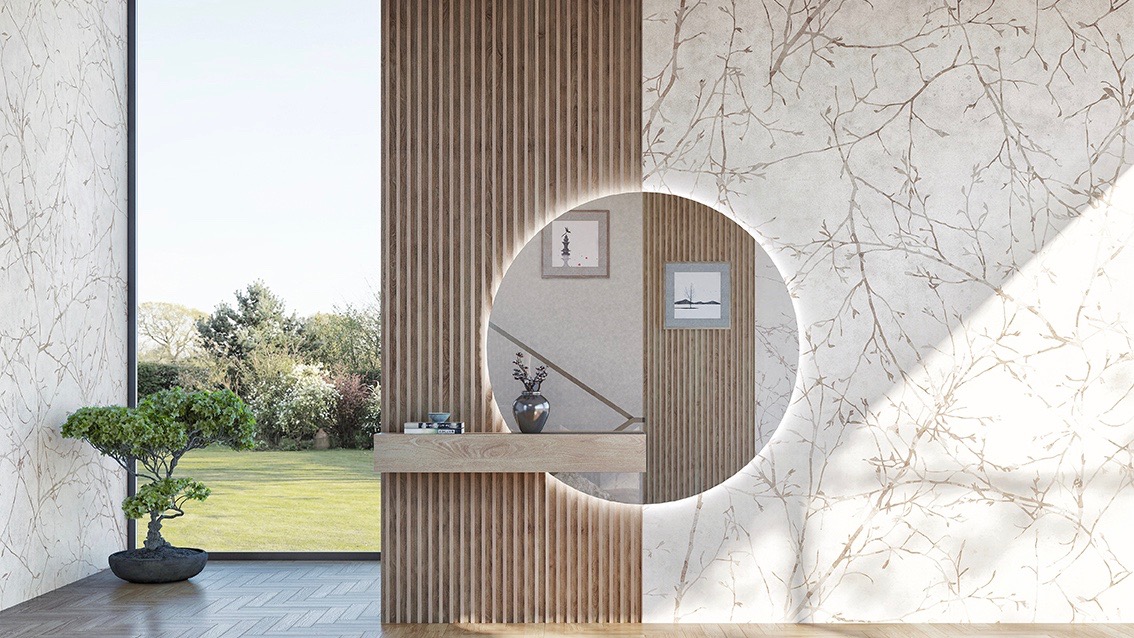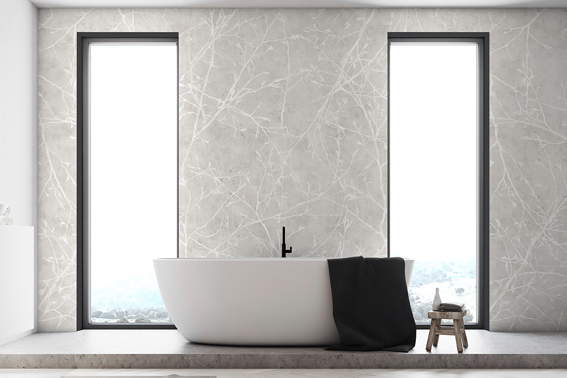 La trama della carta da parati Ambientha si caratterizza con rami e germogli che si protendono verso la luce, pronti e impazienti per la stagione delle fioriture.