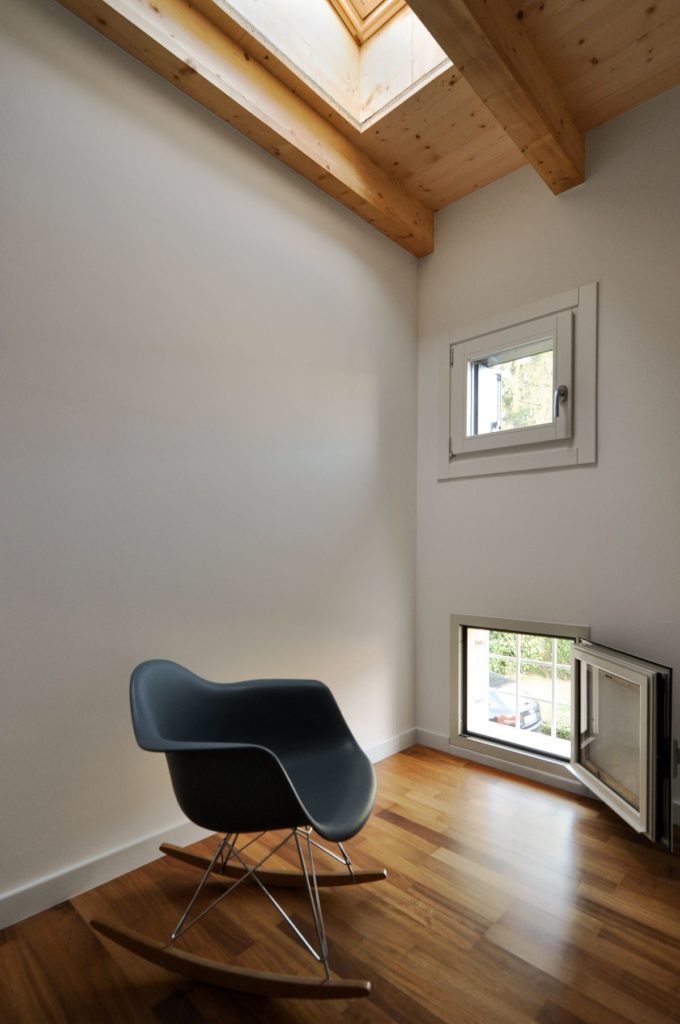 La finestra della camera da letto viene dotata di un elemento oscurante costituito da una tapparella metallica avvolgibile. Il cassonetto della tapparella è posizionato al di sopra dell’apertura, lungo il lato esterno, in spessore con la parete. Le finestre sono caratterizzate dalla presenza di un imbotte metallico che crea una cornice che circoscrive ogni apertura fungendo contemporaneamente da elemento decorativo e da davanzale. Ogni imbotte ha uno spessore di 3 cm e fuoriesce dal filoparete di 5 cm. Nella parte superiore dell’apertura, l’imbotte va a inserirsi tra le doghe in larice e il telo impermeabile di protezione della trave/parete e cappotto in modo da garantire lo scolo dell’acqua meteorica della facciata.