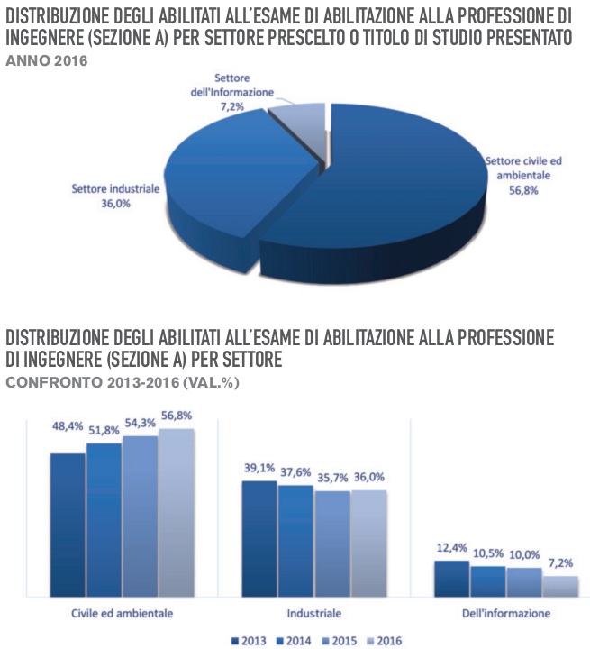 Sebbene il numero di iscritti all’Ordine degli Ingegneri si mantenga stabile o addirittura in lieve crescita (240.014 nel 2018, contro i 239.389 dell’anno precedente), nel 2016 è proseguita la flessione del numero di coloro che hanno affrontato l’esame per l’abilitazione alla professione d’ingegnere.