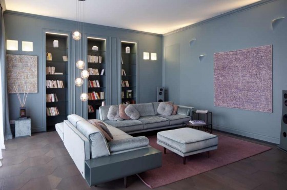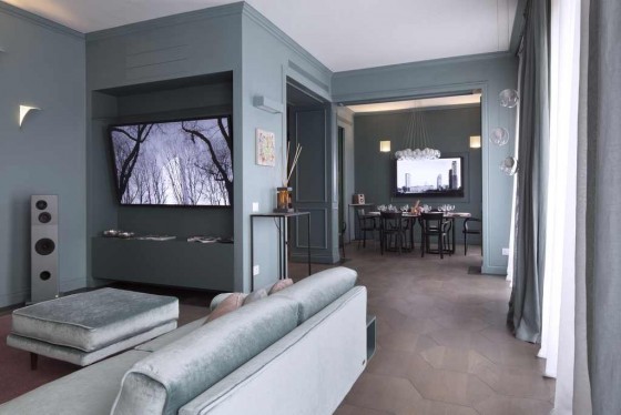 edilizianews.it I colori riposanti, di spirazione nordica, nel living di Atelier Durini 15 I due grandi schermi del living e della zona pranzo (foto di Matteo Cirenei)
