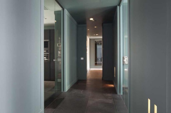 La zona pranzo, dominato da un altro grande schermo Tv di Nec, è caratterizzata da rigore formale e da un’estrema pulizia da di Saint-Gobain per Scrigno, due coppie di evanescenti porte scorrevoli in cristallo riflettente sui toni del verde separano la zona pranzo dal corridoio e conducono in quella che il progettista definisce “cucina industriale su misura”.