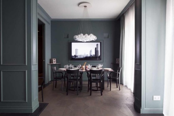 I colori riposanti, di spirazione nordica, nel living di Atelier Durini 15 I due grandi schermi del living e della zona pranzo (foto di Matteo Cirenei)
