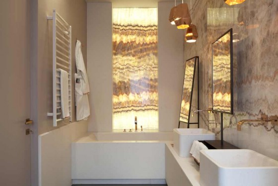 edilizianews.it Nel bagno padronale “lei” la parete, in onice crema a macchia aperta, sulla vasca è retroilluminata (foto di Matteo Cirenei)