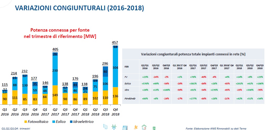 Le nuove installazioni di fotovoltaico, eolico, idroelettrico e bioenergie raggiungono complessivamente circa 106 MW circa un -11% rispetto allo scorso anno. Di seguito i dati rilevati dall’analisi Anie Rinnovabili.