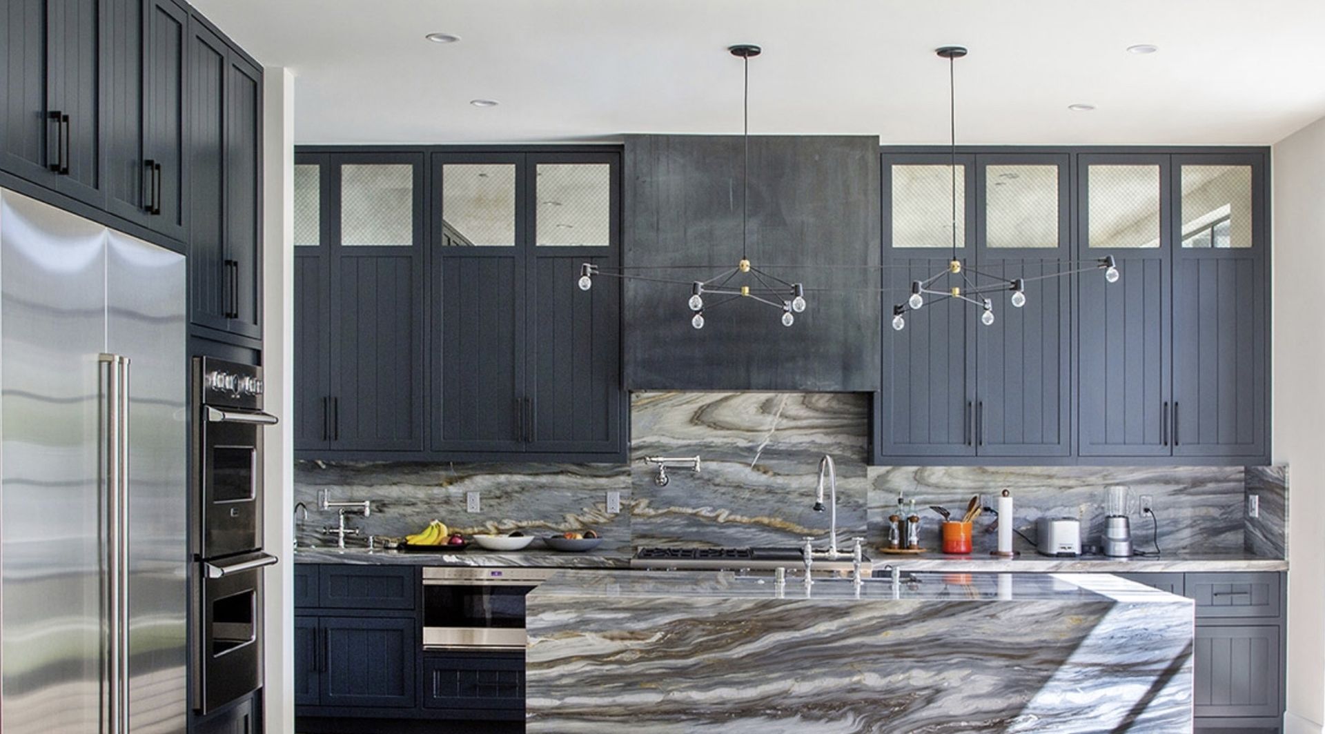 Una cucina vasta e luminosa valorizzata da una pietra naturale: il marmo Calacatta Cielo di Antolini.