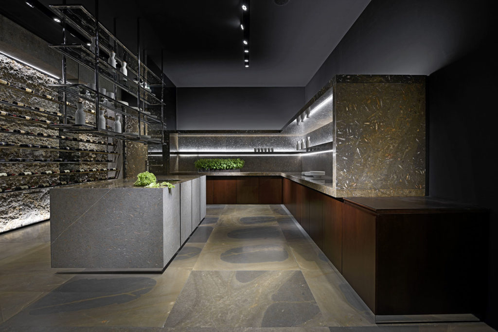 La winery con cucina progettata da Alessandro La Spada con la collezione Jurassic Brown (foto Antolini)