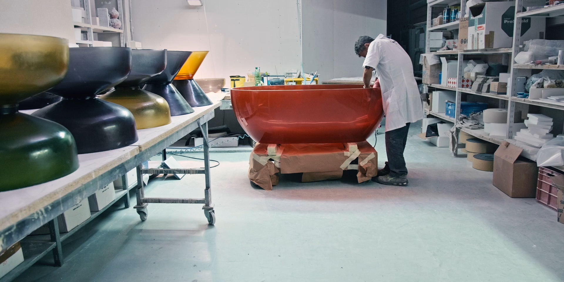 La lavorazione di Cristalmood è artigianale: la resina, allo stato liquido, viene colata negli stampi. Successivamente gli oggetti creati sono rifiniti mediante carteggiatura e lucidatura così da eliminare ogni imperfezione. Per questo motivo ogni lavabo o vasca Cristalmood è un prodotto unico nel suo genere.