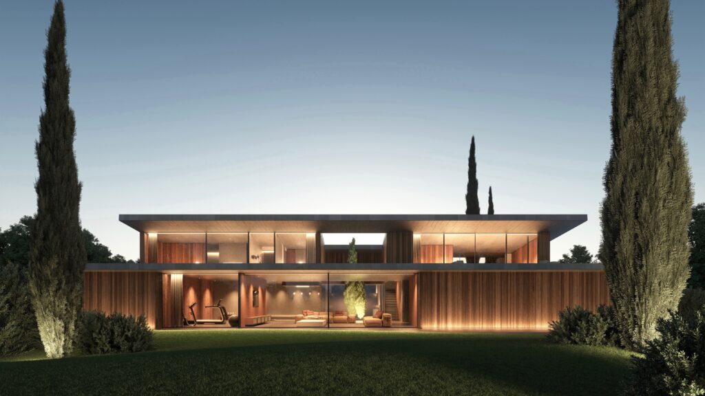 Villa Etna si sviluppa longitudinalmente inserendosi in modo armonico nel panorama circostante, grazie ad un’altezza contenuta e all’uso di materiali naturali e di ampie superfici vetrate.