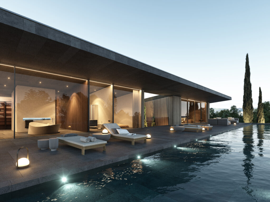 Ad accompagnare lo sviluppo di Villa Etna troviamo la piscina esterna che definisce un’area outdoor direttamente connessa con gli ambienti interni della villa.