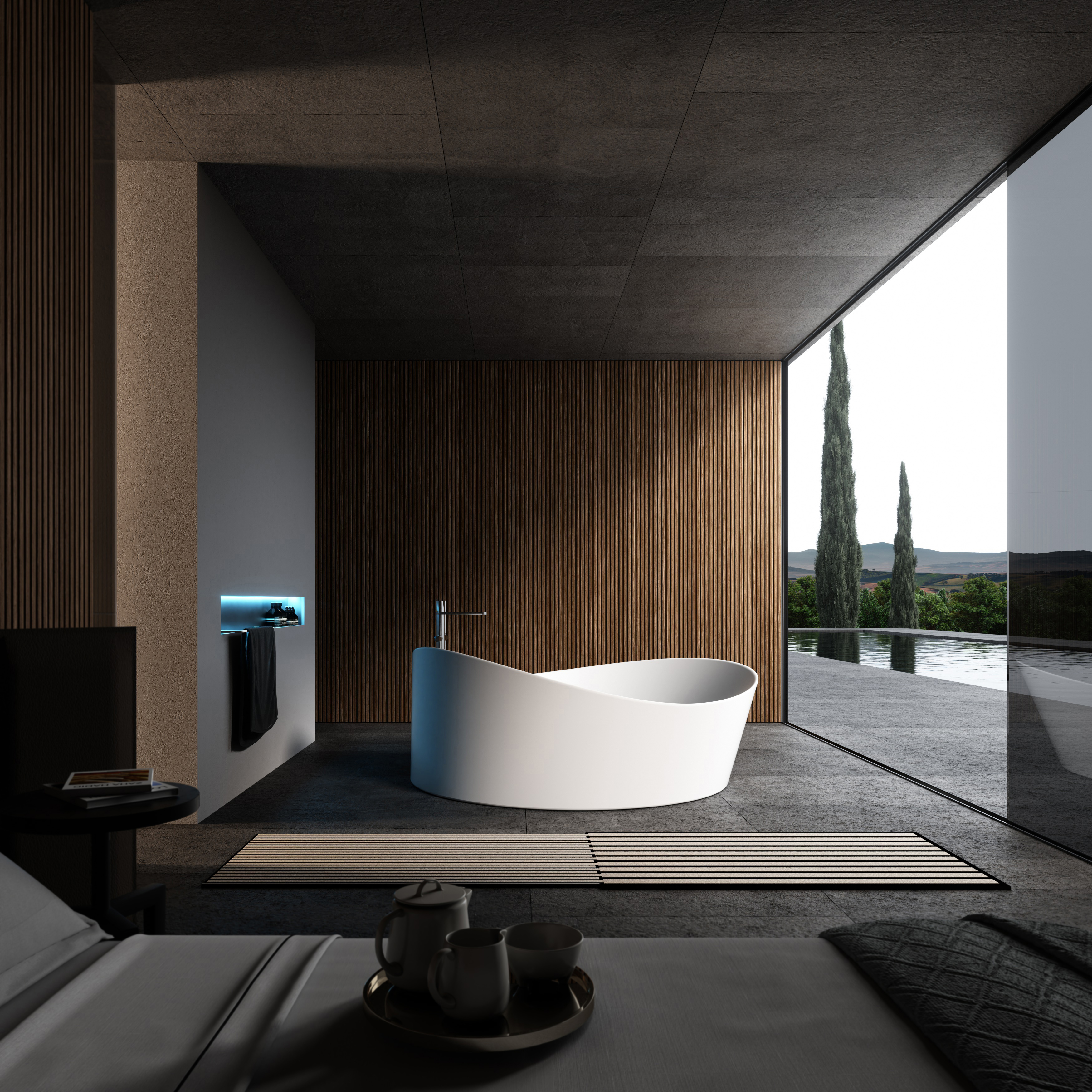 Per il bagno padronale è stata scelta la vasca freestanding Dune disegnata da Marco Ferrarini. La vasca occupa il centro della stanza e offre relax assoluto con una vista impagabile. Sempre nel bagno troviamo i contenitori Bespoke e BeMade disegnati da Carlo Colombo.