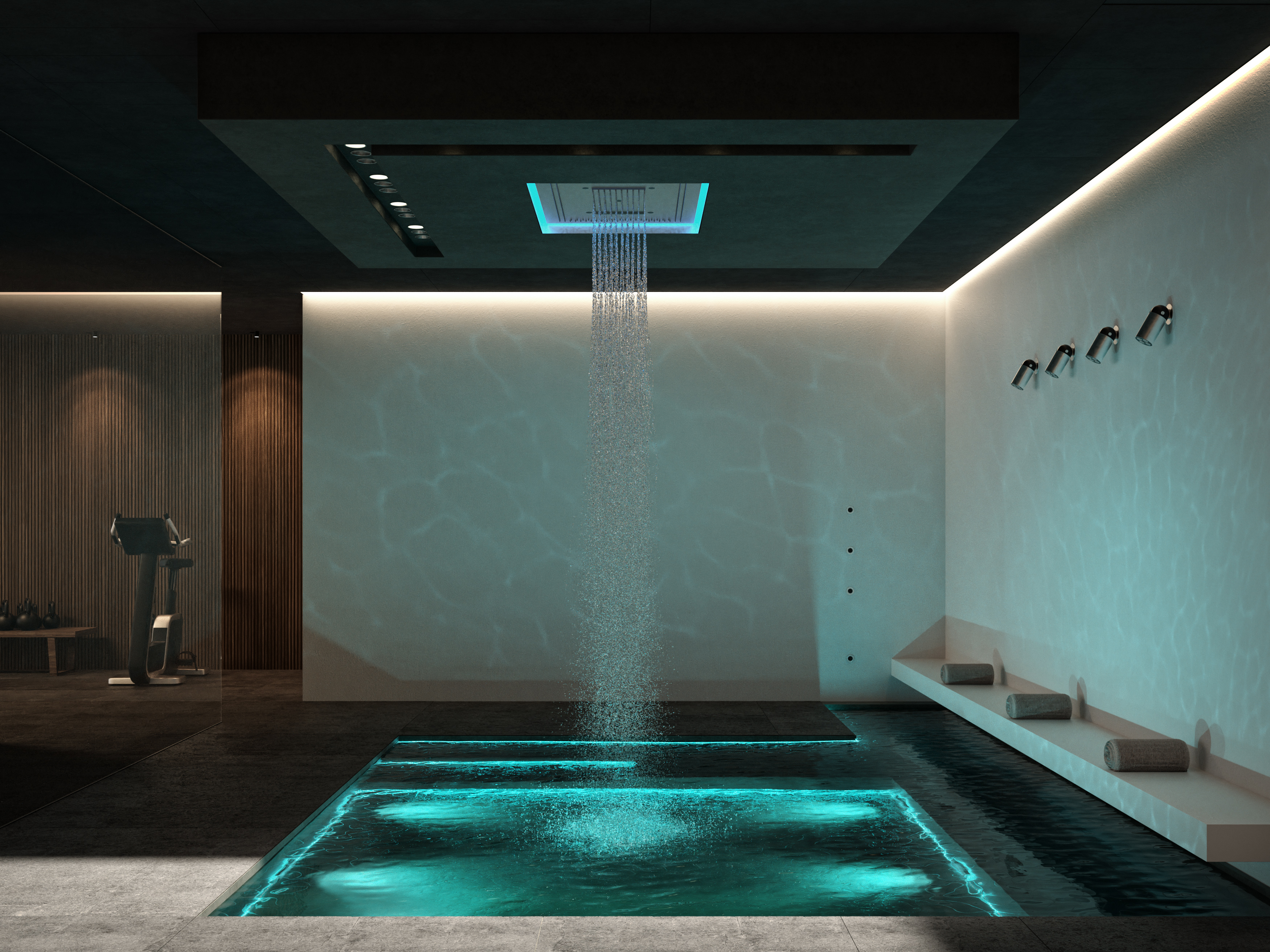 Nel seminterrato l’assoluto protagonista è lo spazio wellness dotato di una piscina coperta. Dall’effetto pioggia del soffione Meteo con cromoterapia integrata, alla potenza del getto di Azimut, i soffioni compatti che rimandano all’immagine di apparecchi luminosi sono collocati in sequenza a parete per un trattamento localizzato. Le collezioni antoniolupi scelte per Villa Etna testimoniano l’approccio tailor made dell’azienda e soprattutto la capacità degli elementi di impreziosire ogni singolo ambiente domestico.