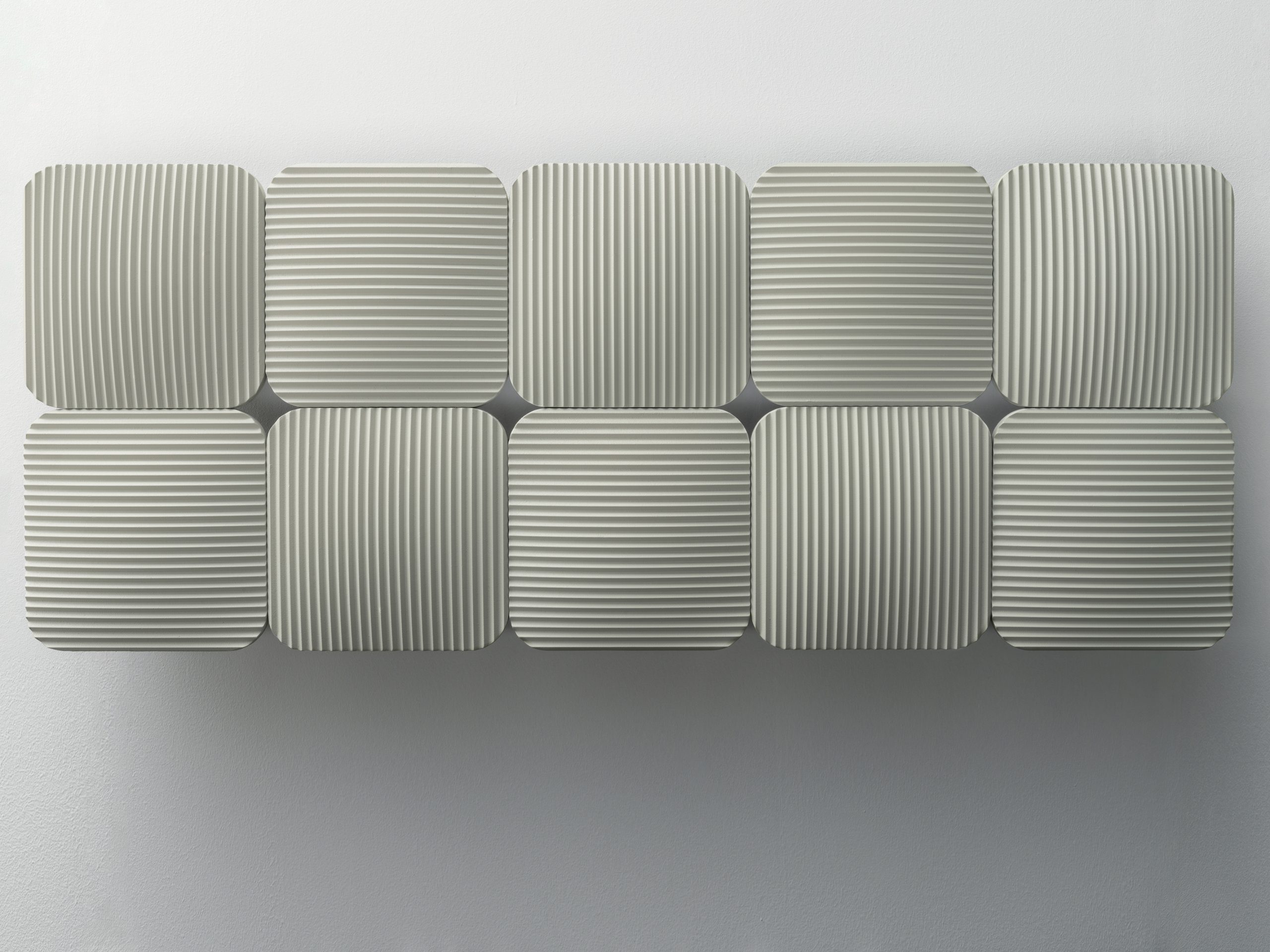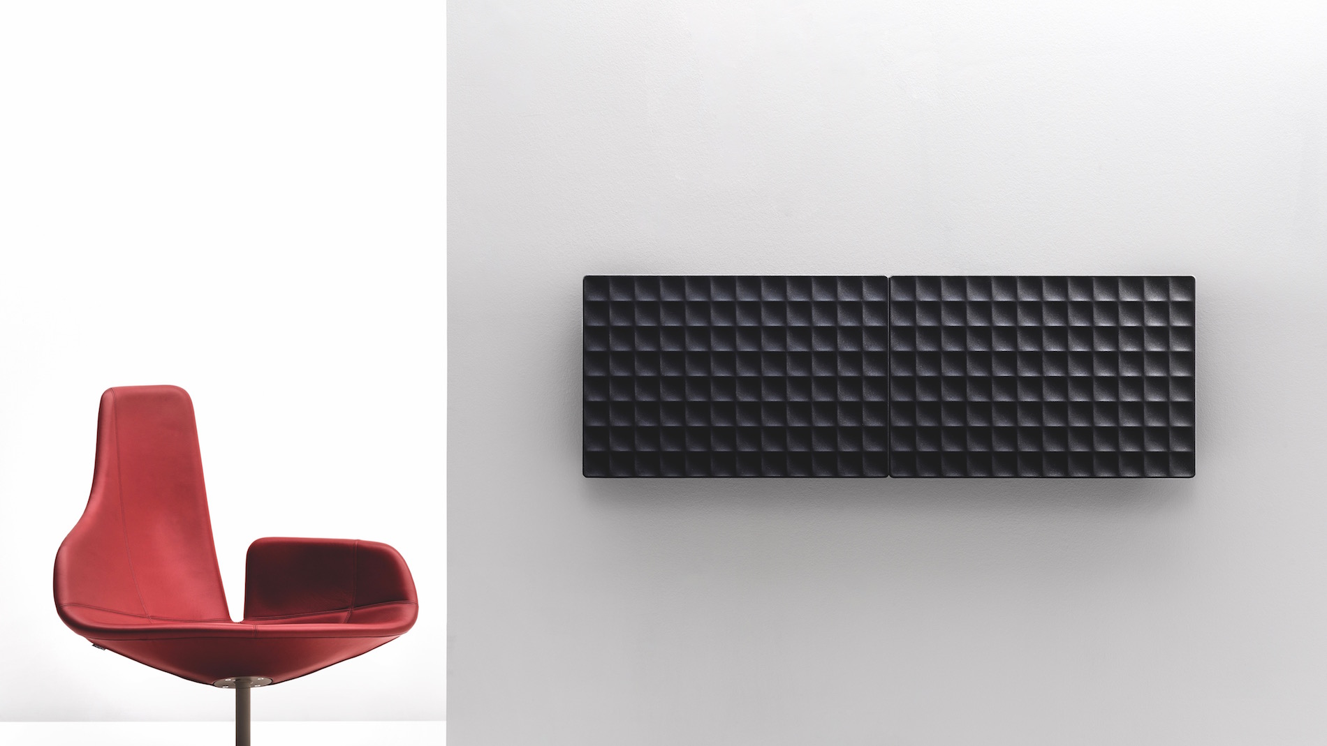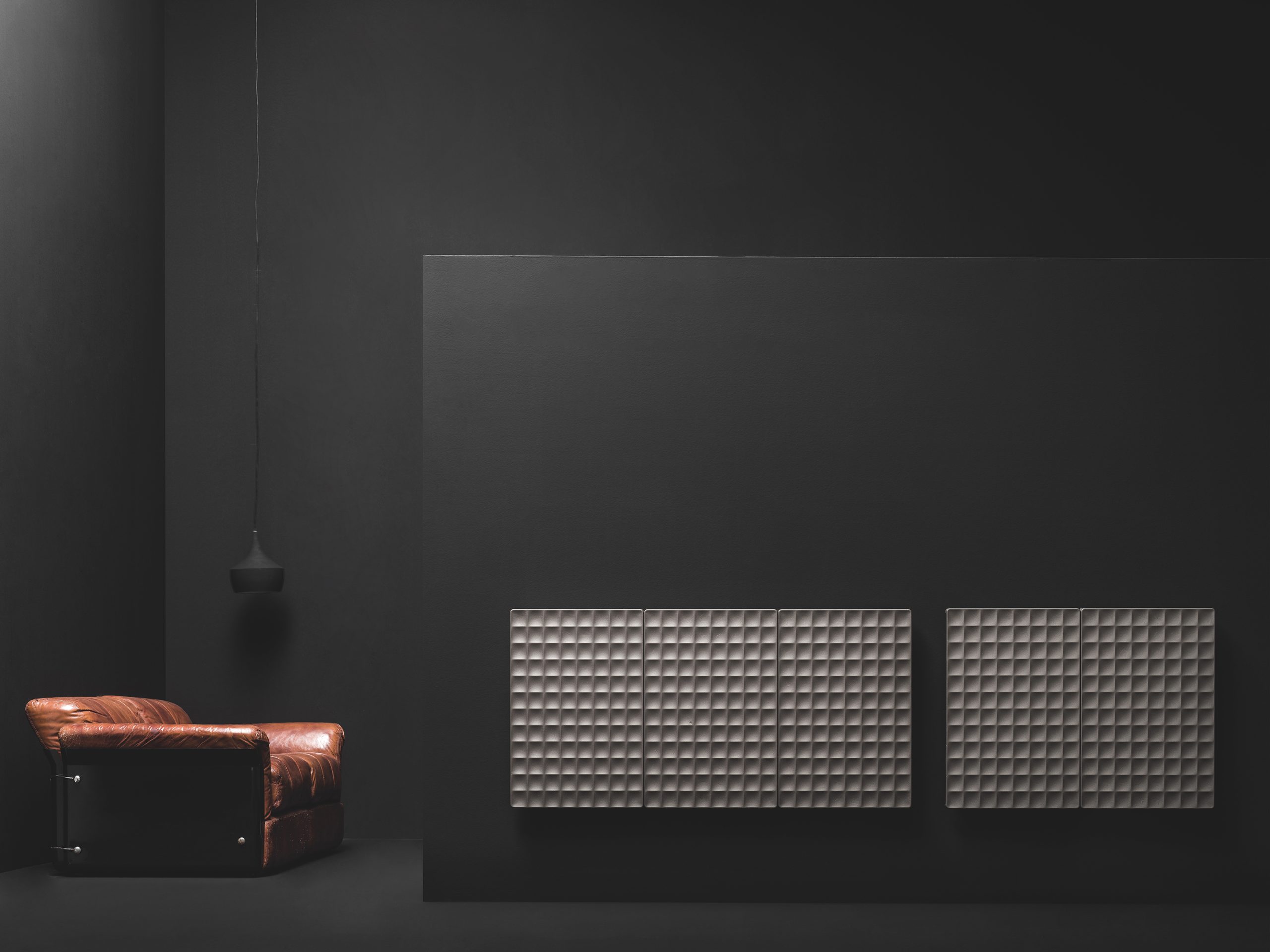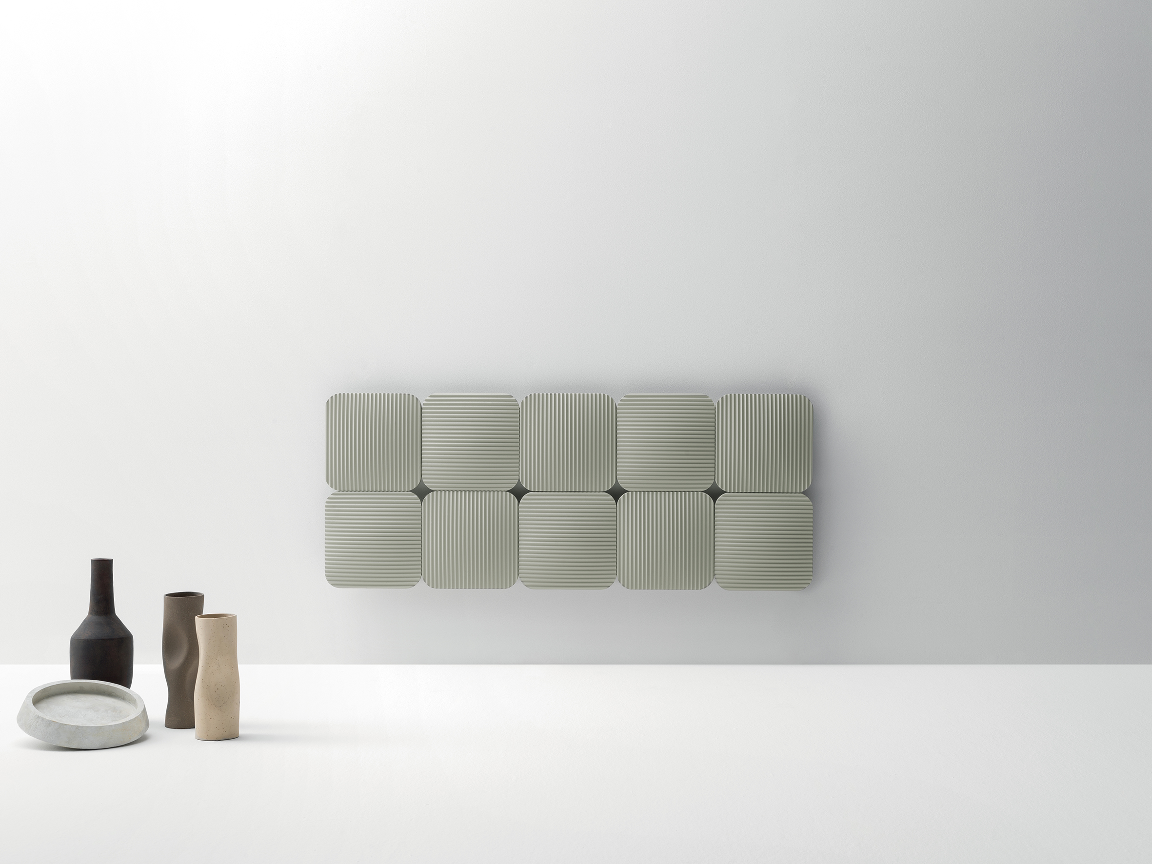 Lana, firmato dallo studio AMDL CIRCLE di Michele De Lucchi, è stato disegnato proprio a partire dall’idea di non avere un’unica versione per un radiatore: è una formella quadrata di 33×33 cm, bombata e con angoli stondati, ulteriormente lavorata con una plissettatura superficiale, che può creare forme rettangolari o quadrate, grazie all’unione di due o più modelli della famiglia