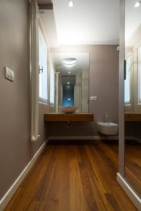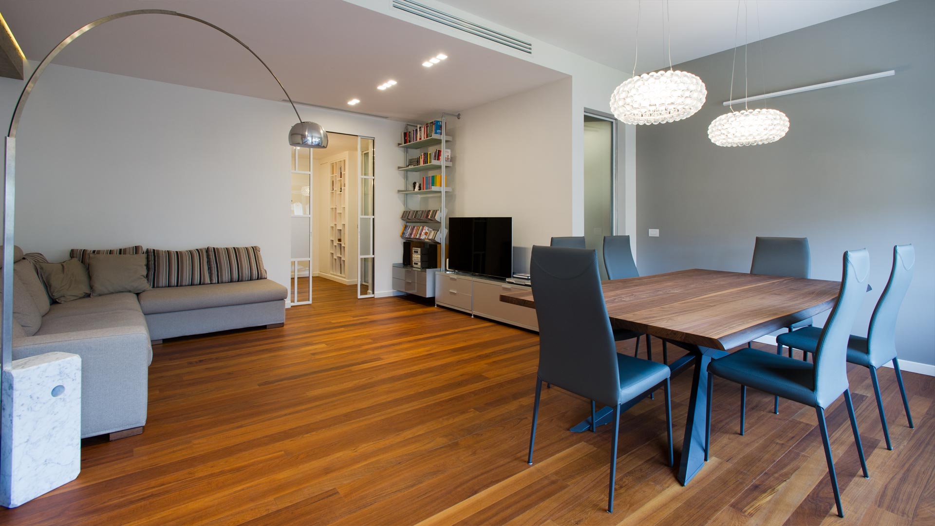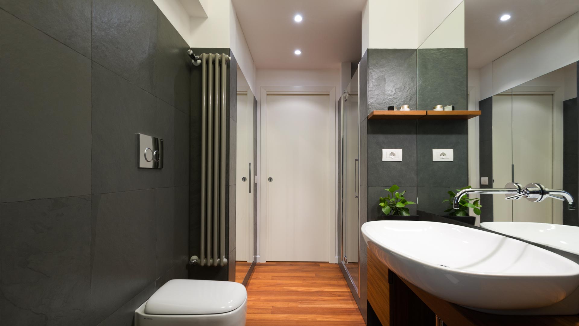 La scelta dei materiali pregiati ricade sul teak per il parquet, la resina per il pavimento della cucina e l’ardesia per il rivestimento dei bagni. Gli arredi sono funzionali e cercano unitarietà e fusione con le superfici verticali bianche, come il sistema di librerie scultoree realizzate su disegno nel disimpegno. L’illuminazione si compone di faretti incassati di supporto ad alcuni pezzi di design distribuiti in tutti gli ambienti. L’impianto di riscaldamento è di tipo tradizionale con corpi scaldanti tubolari: i progettisti hanno optato per il design elegante e senza tempo della linea Ardesia di Cordivari, declinata in diverse tonalità.