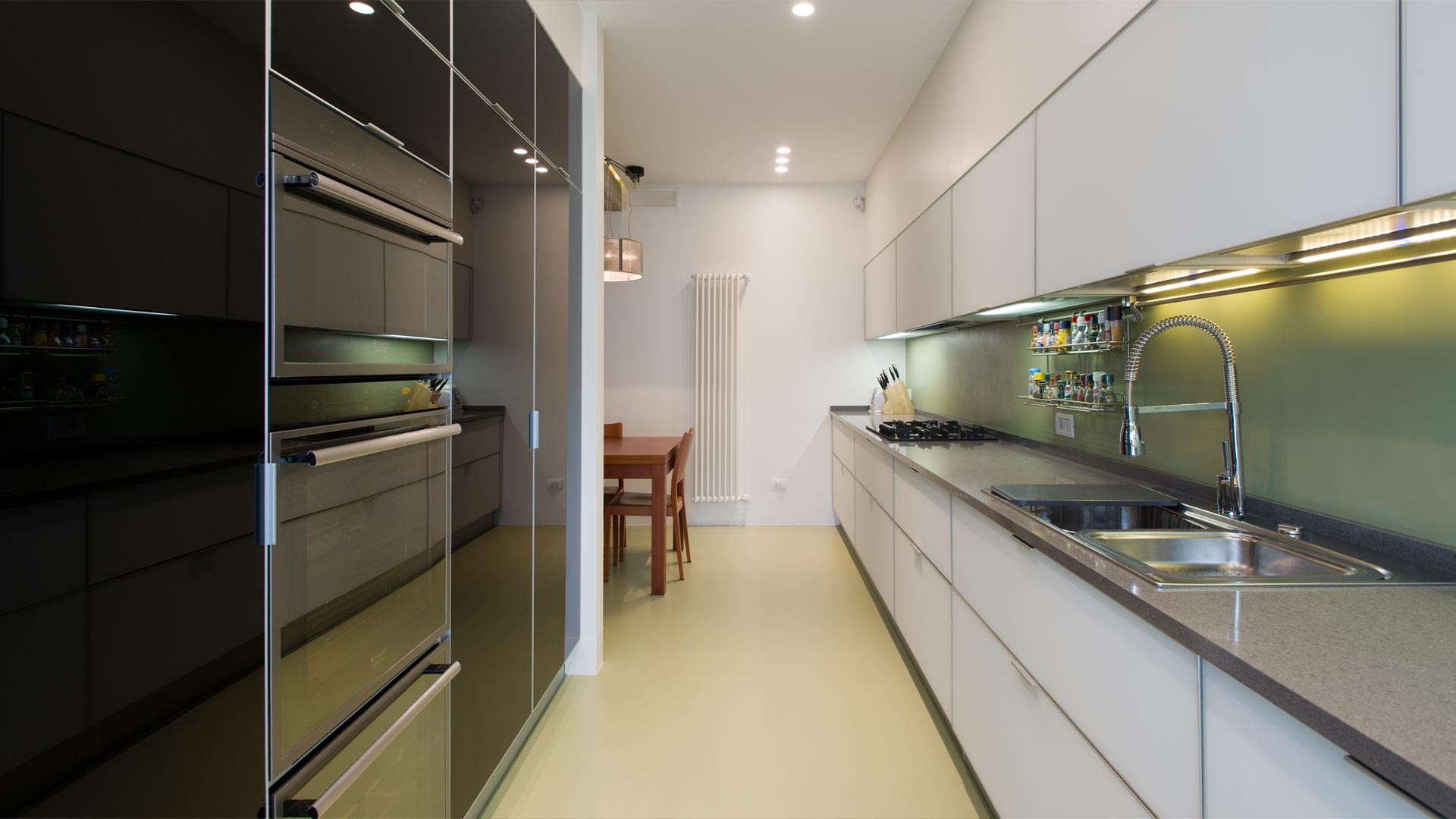 La cucina si compone di una parete dedicata alla preparazione dei cibi con dei contenitori funzionali, e da una zona più tecnica con le colonne degli elettrodomestici di ultima generazione in un colore in contrasto con il resto. Caratterizzata da un’elegante essenzialità, alterna superfici bianche opache ad altre scure e lucide e ai metalli satinati degli elettrodomestici. Unica nota di colore il paraschizzi in colore verde oliva.