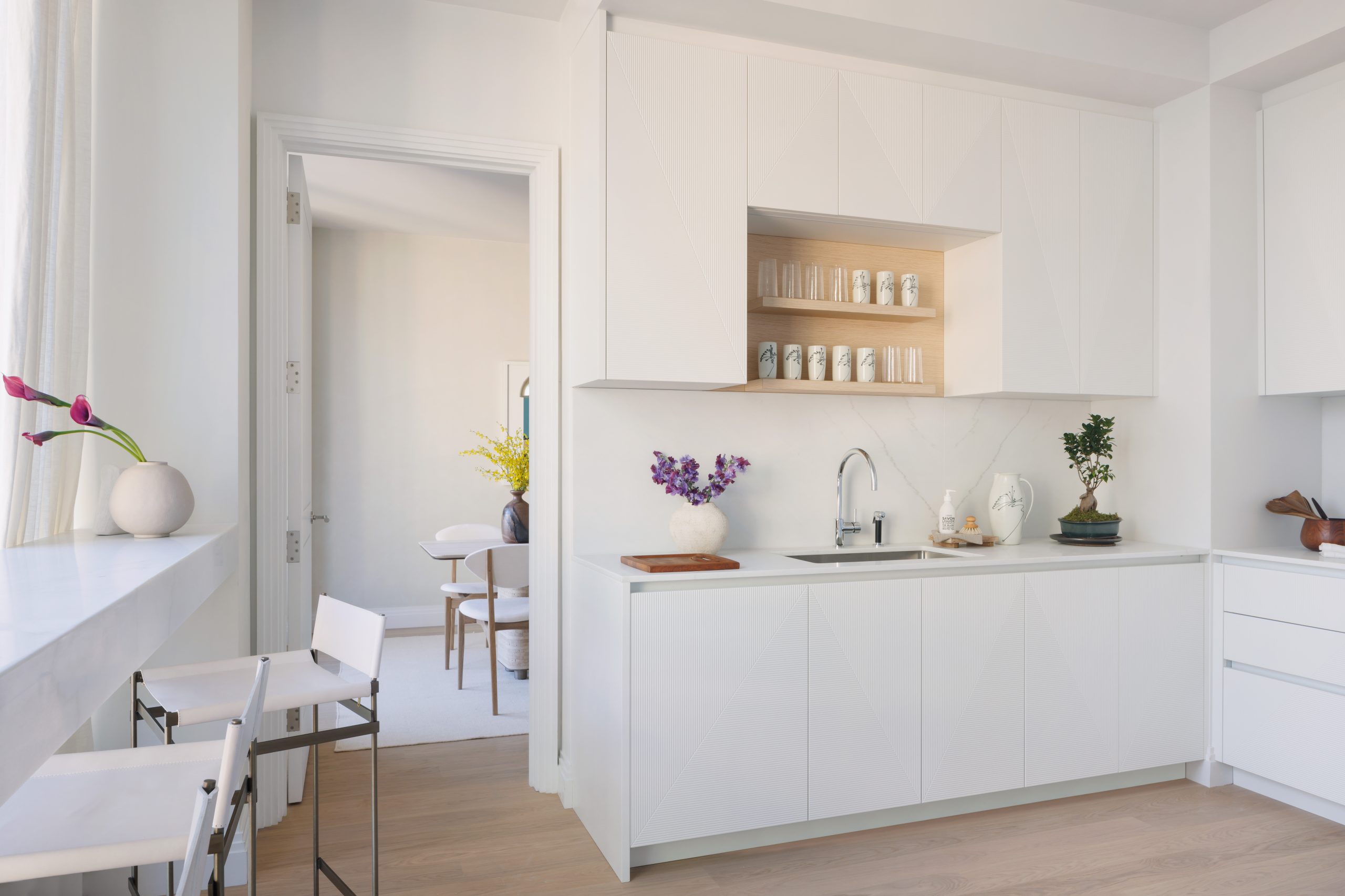 In linea con la sua esperienza nei progetti contract globali, Aran Contract ha personalizzato materiali e finiture secondo le specifiche dell’architetto. Le cucine presentano ante con un design millerighe laccato opaco bianco, arricchite da fughe che creano un sofisticato motivo romboidale. Questa realizzazione su misura evidenzia l’abilità di Aran Contract nel combinare estetica, funzionalità e personalizzazione.