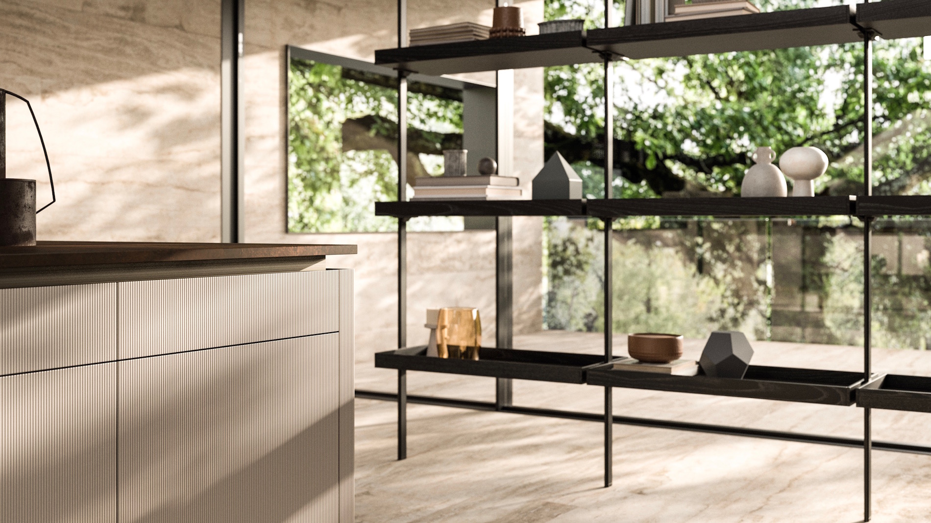 La possibilità di assemblare il vetro cannettato su un frame con profili verticali per l’apertura rappresenta un ulteriore livello di personalizzazione e flessibilità. Questo approccio non solo permette di creare composizioni su misura, soddisfacendo le esigenze estetiche e funzionali di ogni cliente, ma definisce ulteriormente il design di Bijou, conferendo all’anta in vetro una forte identità visiva. Il frame in titanio, elegante e moderno, si integra perfettamente con tutte le finiture, elevando l’intera composizione a un’immagine di alto design.