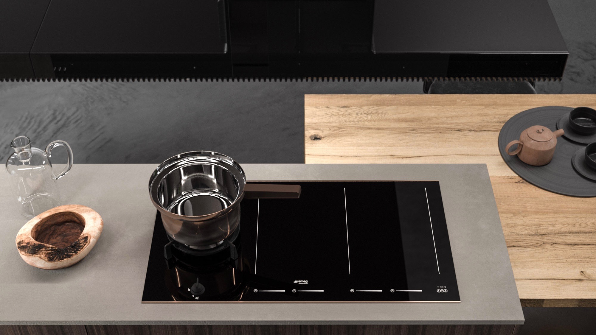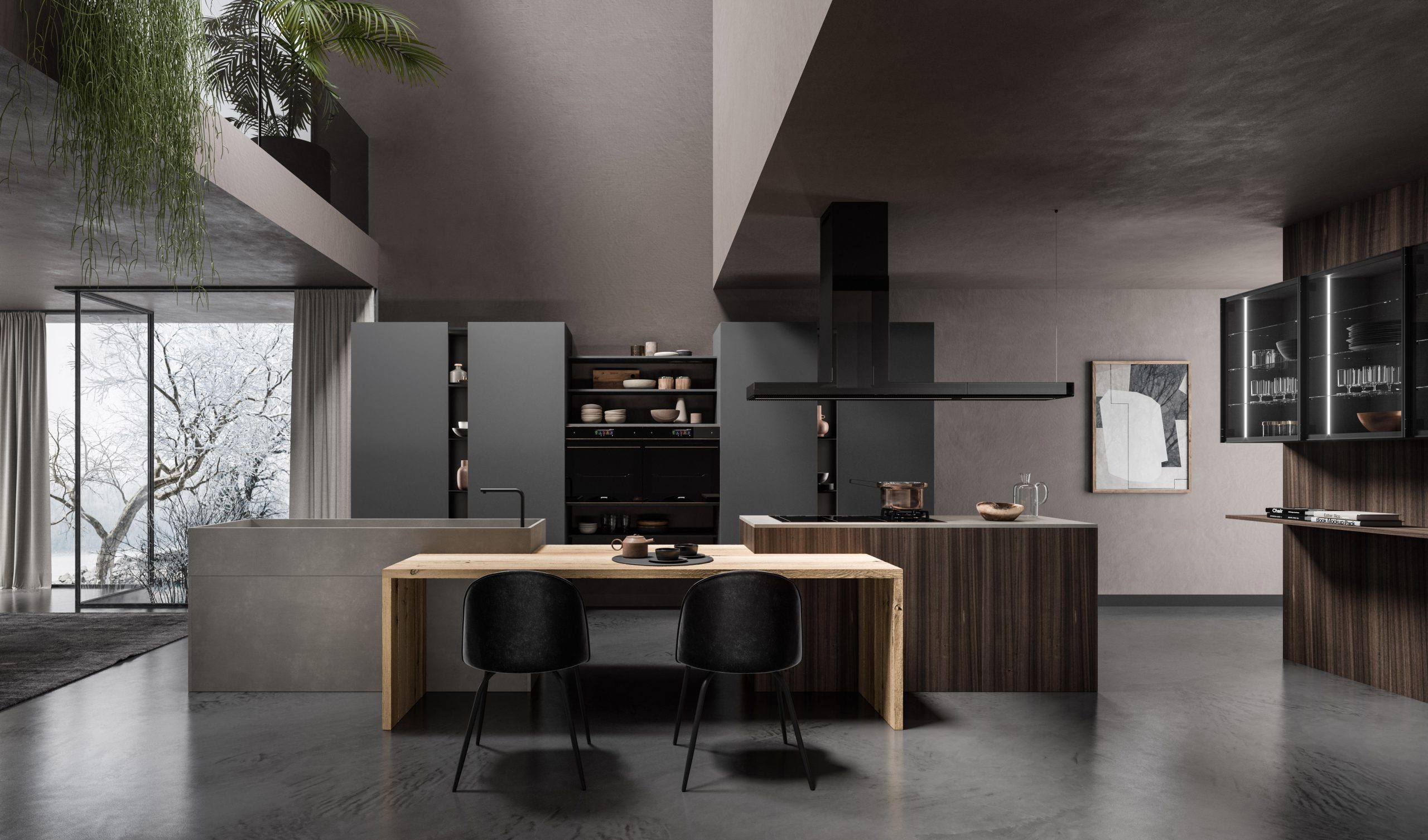 L’isola centrale è composta da due blocchi: uno, squadrato e monolitico, dedicato all’area lavaggio con un lavello a vasca integrato al top in Gres Barro Satin, e l’altro – delle medesime dimensioni – predisposto come zona cottura con piano a induzione.