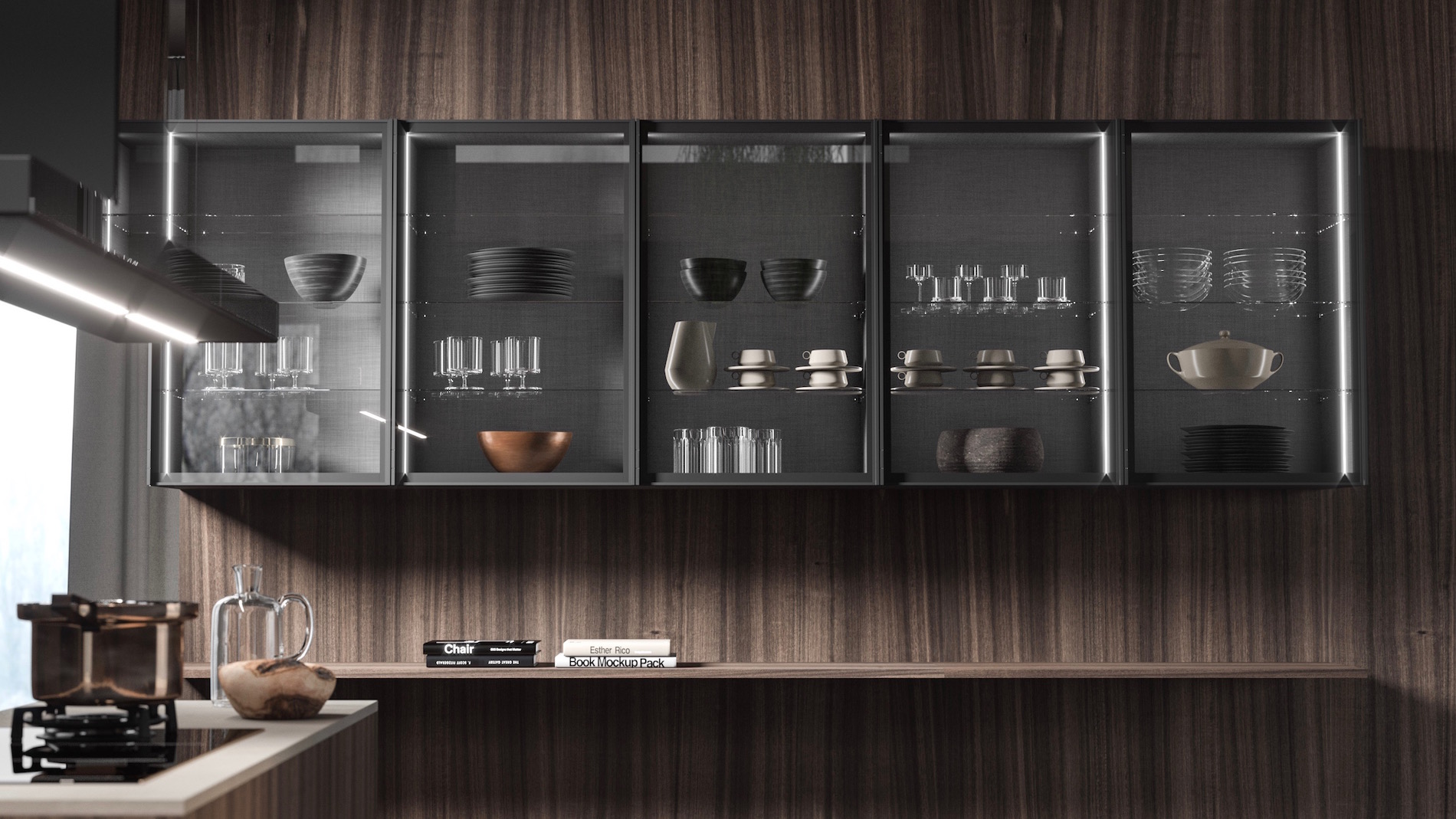 Avere a disposizione e in modo immediato stoviglie, oggetti ed elettrodomestici, tutti a vista, facilita le attività più semplici che si svolgono in cucina e permette di sfruttare la superficie parete. La boiserie attrezzata si completa ai lati con un sistema a sviluppo verticale con colonne e moduli a giorno Grigio Grafite per contenere in modo organizzato altri strumenti d’uso quotidiano.