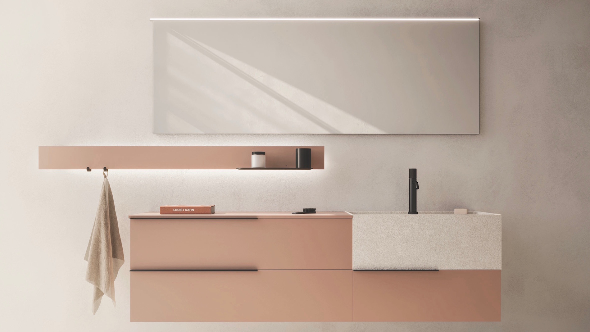 Blu Lapponia per la composizione Code #06 per creare un ambiente raffinato, avvolgente e non banale; Tan Pink per la proposta Sky #14 capace di trasmettere una sensazione di leggerezza e tonalità Cachi per il mobile Teso #01 che richiama la terra e la natura e dà vita a un’atmosfera accogliente e rilassante.