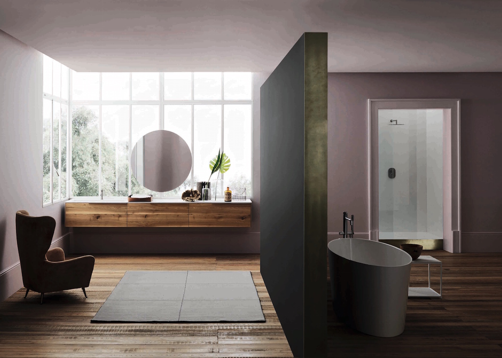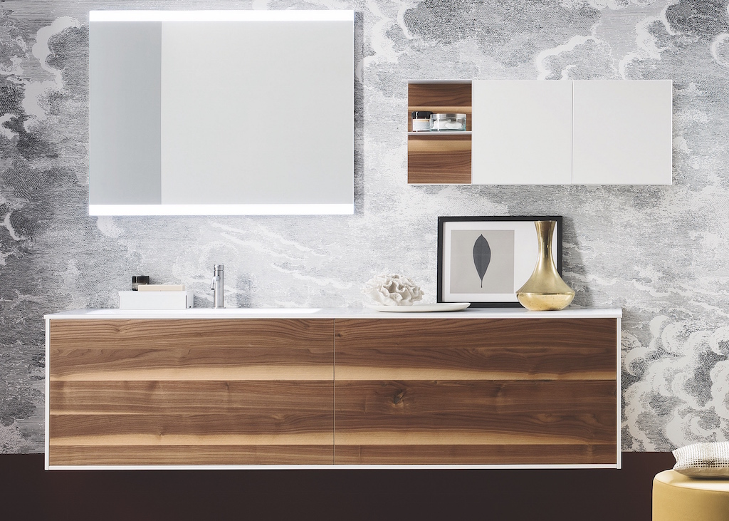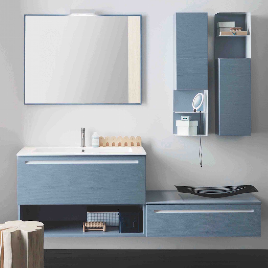 Tra le finiture disponibili, laccati in 50 colori, rovere laccato in 50 tonalità oppure patinato in diverse gradazioni naturali, ottanio. Il sistema si completa con specchiere, faretti e accessori.
