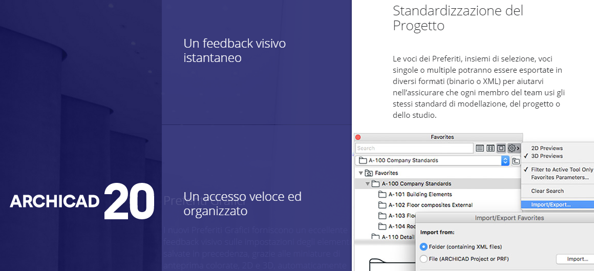 Preferiti grafici. I nuovi «Preferiti grafici» forniscono un ottimo feedback visivo sulle impostazioni degli elementi, salvate in precedenza, grazie alle miniature 2d e 3d di anteprima colorate, generate automaticamente e disponibili per qualsiasi strumento (usando semplicemente il drag and drop l’accesso è ancora più facile). Archicad 20 consente un feedback visivo istantaneo, un accesso veloce ed organizzato, elevata standardizzazione del progetto e visualizzazione del Bim. Le voci dei Preferiti, insiemi di selezione, voci singole o multiple potranno essere esportate in diversi formati (binario o Xml) per assicurare che ogni membro del team di progettazione usi gli stessi standard di modellazione utilizzati dal progetto o dello studio.