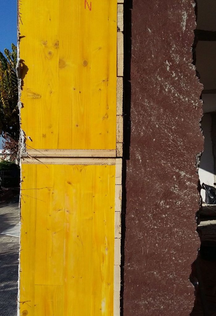 Il retro dei telai è stato chiuso con un assito in legno grezzo dello spessore di 2,5 cm con l’ulteriore funzione di controventatura. La parte frontale è stata invece lasciata aperta e preparata per la successiva fase di intonacatura.