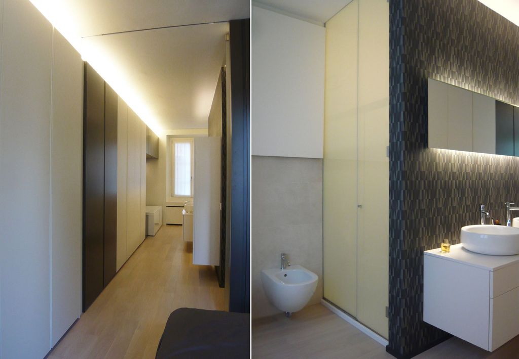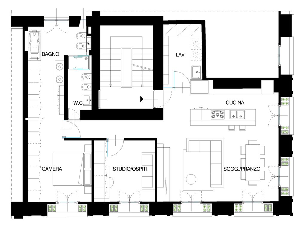 Così il ritmo, dettato dalla presenza delle finestre affacciate sullo spazio pubblico della piazza, ha suggerito un progetto incentrato proprio sulla luce, sulle aperture e sulla realizzazione di ambienti fluidi, in grado di valorizzare la luce naturale presente durante le ore del giorno nell’appartamento.