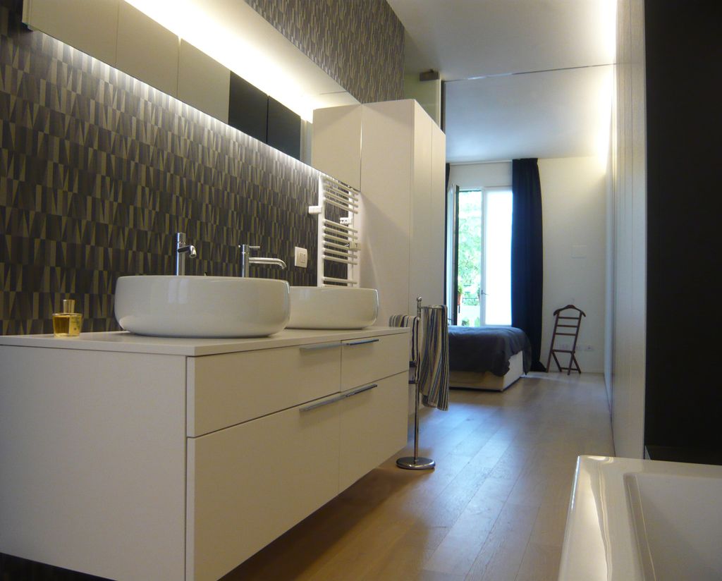 Uno studiolo/camera per ospiti e un bagno di servizio, con accesso dal corridoio e comunicante attraverso la doccia al bagno padronale, completano il programma funzionale dell’intero progetto. In questo modo i due ambiti della casa si relazionano tra loro tramite un corridoio e comunicano attraverso porte in vetro che garantiscono luminosità a tutti gli ambienti.