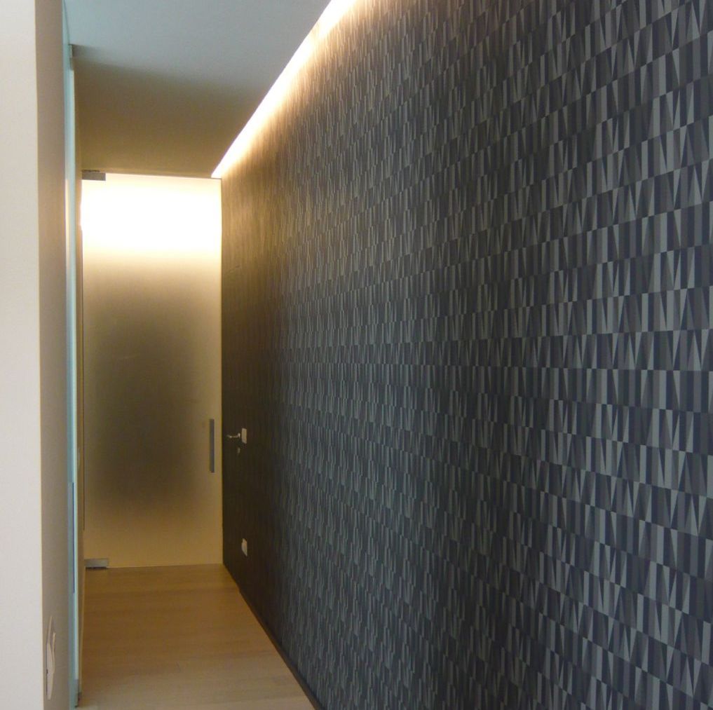 Tutte queste caratteristiche progettuali, come ha rimarcato il progettista, sono state riprese e sottolineate anche dall’illuminazione artificiale, risolta con lunghe linee di luce indiretta e ottenute con semplici tubi eco-neon nascosti dalle armadiature, che sottolineano le dimensioni dei locali e distribuiscono in modo diffuso la luce.