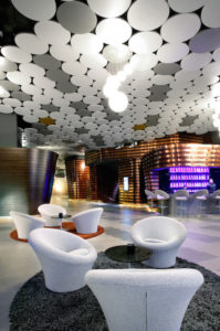 I profili perimetrali Axiom Canopy permettono di creare “soffitti a isola” per un effetto suggestivo in zone reception, postazioni di lavoro, aree di incontro, sale riunioni e open space. La possibilità di integrare l’illuminazione all’interno degli elementi discontinui permette ancora una volta di dar vita a progetti di design che trasformano i controsoffitti i in elementi d’arredo. Optima Baffles sono invece i pannelli in fibra minerale rivestiti da un’apposita colorazione bianchissima per una riflessione della luce pari all’87%. Adatti ad ambienti rumorosi come scuole, centri ricreativi e snodi di trasporto o dove si desidera nascondere un plenum o un soffitto poco accattivante. In alternativa, l’opzione curvi, con bordo dei pannelli a forma d’onda, crea un effetto visivo dinamico.