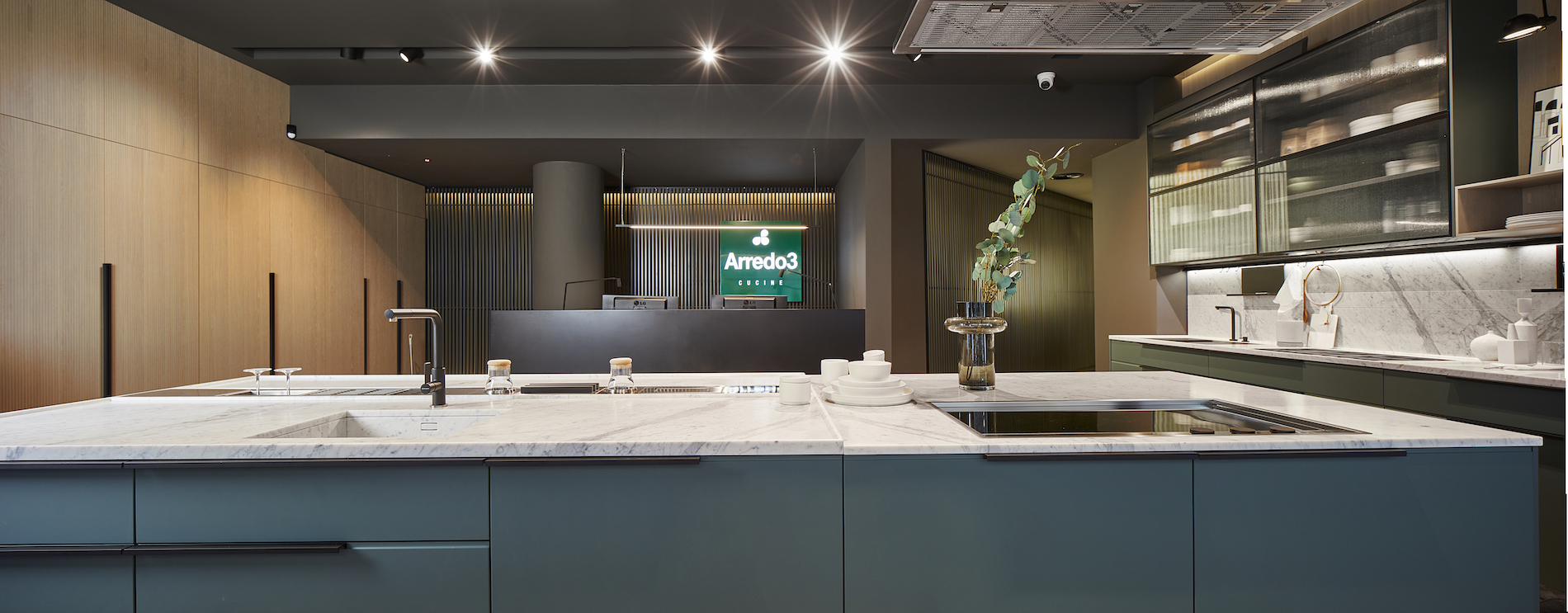 L’allestimento Gaia inserisce materiali eco-compatibili o riciclati in alcuni modelli di cucine Arredo3 oltre a maniglie, top e complementi di modo da poter realizzare una cucina dal basso impatto ambientale.
