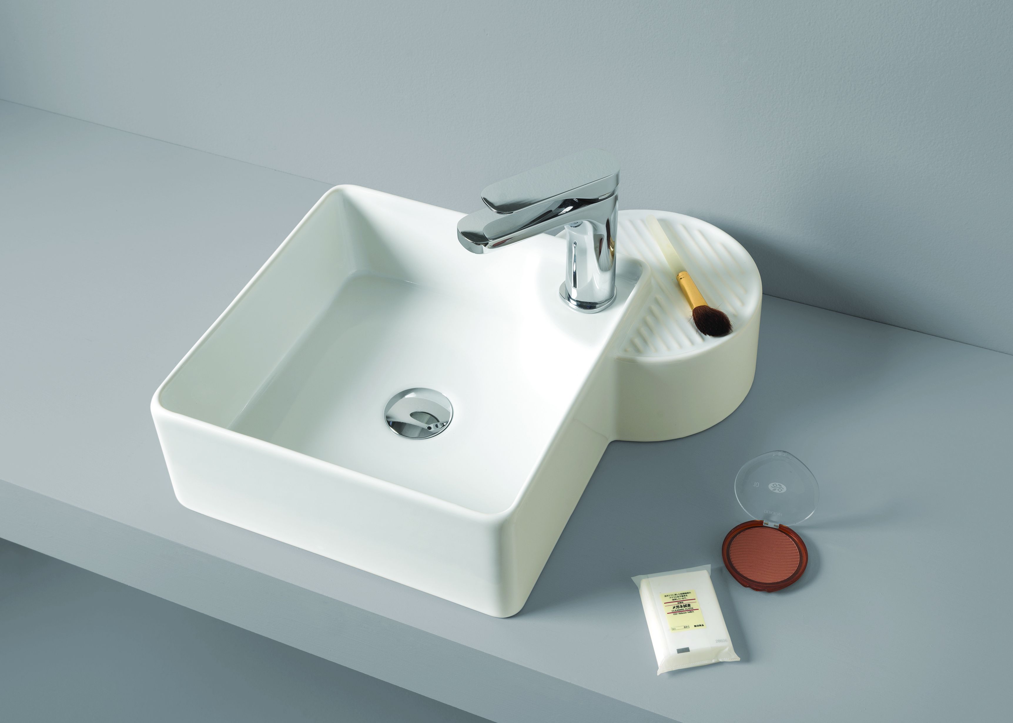 Una definizione tridimensionale di trend grafici prestati a una collezione di lavabi d’arredamento alla moda, freschi e funzionali. Memphis e minimalismo sono i riferimenti, con colori vivaci e intersezioni di geometrie basilari sfacciatamente anni’80, a dialogare con pieni e vuoti minimal di inizio secolo. Una piccola esplosione Pop prestata al mondo bagno, per unire tratti e geometrie pure con funzioni ed ergonomie standard del lavabo main stream d’appoggio.La zona lavabo si personalizza con un segno decorativo essenziale, attraverso lavabi in forme diverse combinati con i rispettivi piani di appoggio. La collezione prende spunto direttamente dagli anni Ottanta e i lavabi sono previsti nelle versioni ovale, quadrata, rettangolare o tonda.