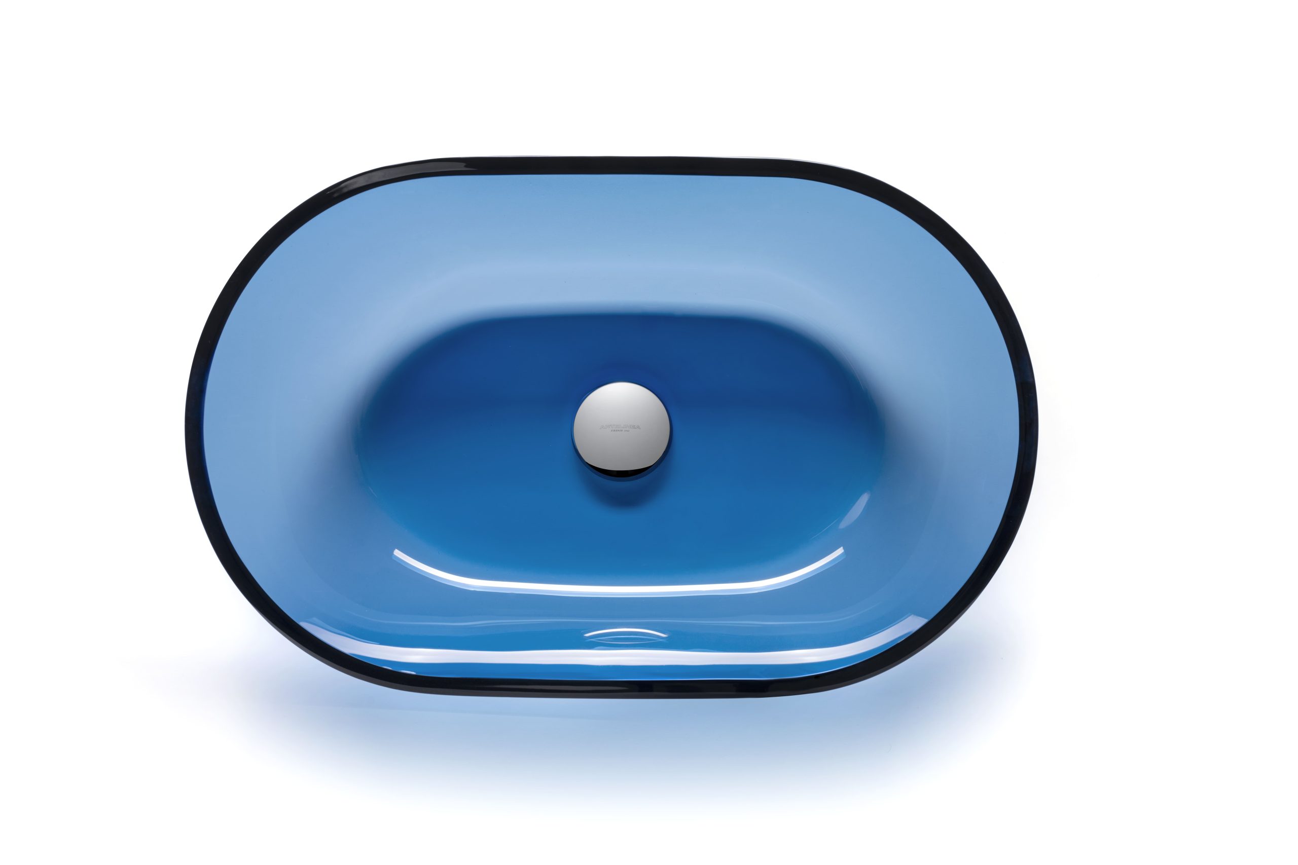 I lavabi sono disponibili in un’unica misura, completa di anello alla base, in cristallo extrachiaro trasparente o colorato traslucido, nelle finiture Bronzo, Ambra, Fumè e Blu traslucido e in Opalite in nero. Inoltre, i lavabi sono disponibili anche in solid surface.