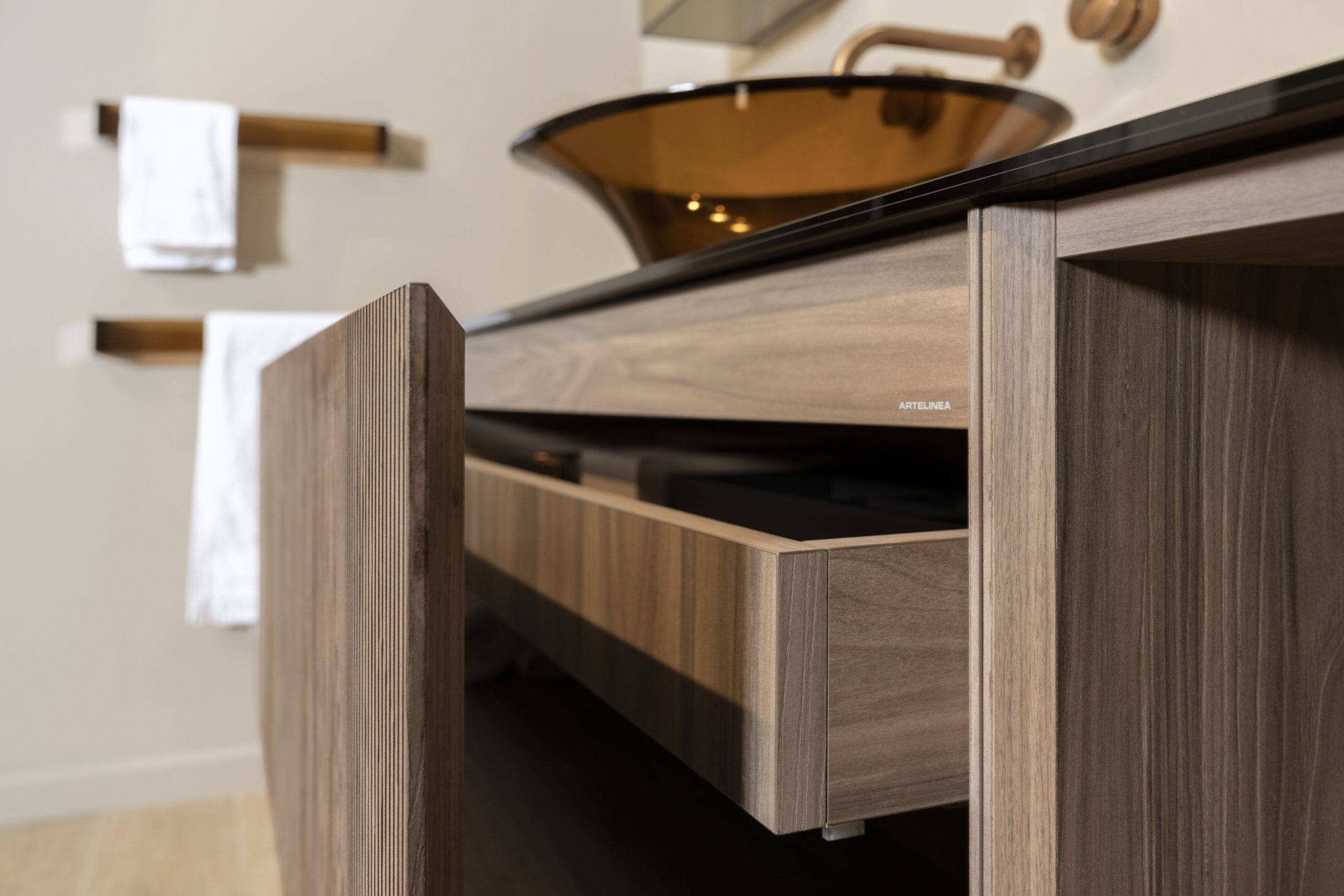 La lavorazione “groove” diventa un elemento chiave per interpretare questa nuova direzione artistica. Il vetro, materiale distintivo di Artelinea, si combina con il legno, creando un contrasto che evoca l’immagine di una foresta secolare. Lo Studio Bizzarri ha dichiarato che questa finitura dimostra come il legno, se abbinato al vetro, possa acquisire ancora più valore.